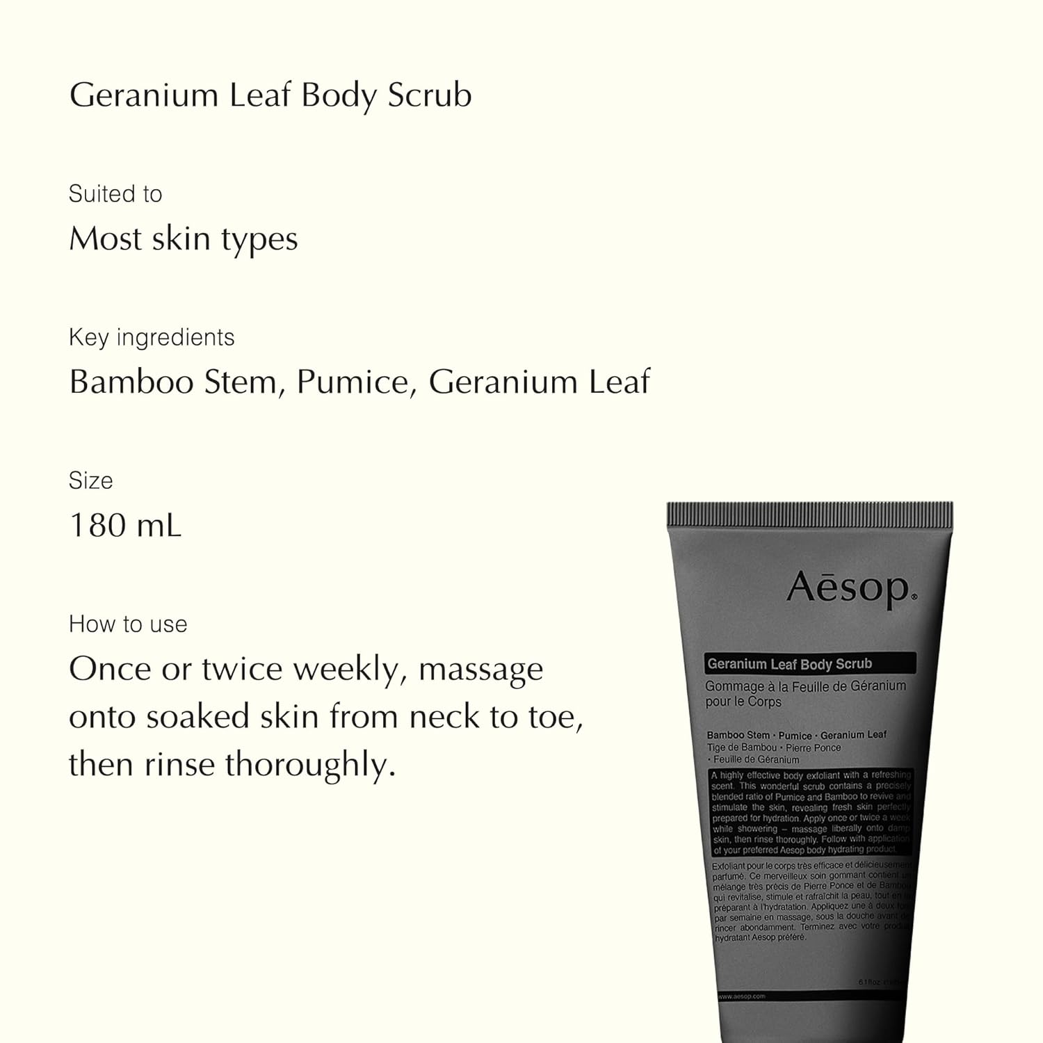 Aesop Geranium Leaf Body Balm: A rich blend of nourishing nut oils, skin-softening ingredients and Geranium Leaf and Citrus extracts to provide exceptional hydration.