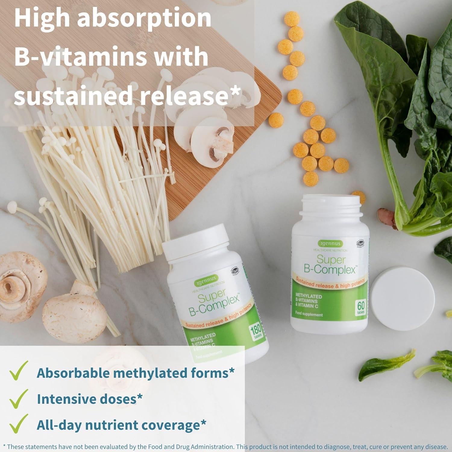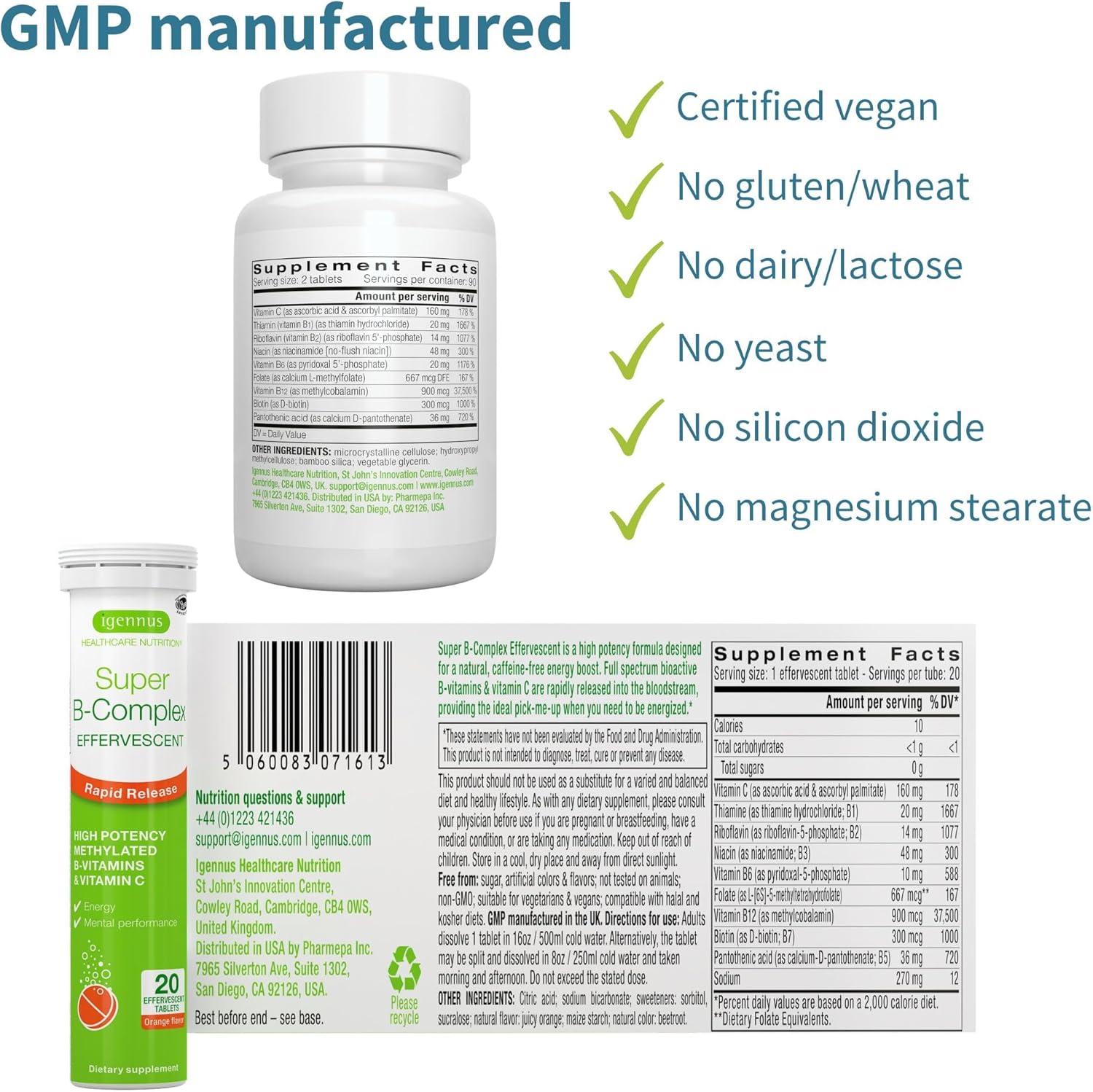Super B-Complex Bundle, 180 Sustained-Release Tablets & 20 Orange Flavor Effervescent Tablets for Fast Energy On The Go, by Igennus