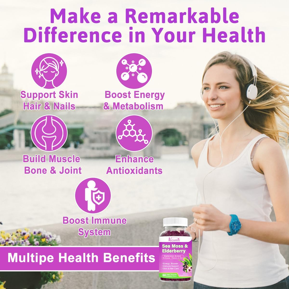 [Natural, Zero Sugar, Great For The Whole Family] Made with 100% natural and organic, pure ingredients, the sea moss gummies with elderberry, Zero sugar, Non-GMO, gluten-free, gelatin free, and free of artificial color, flavor, sweetener, preservative. A safe and perfect choice for your whole family, including women, wen, adults, kids and the elderly.