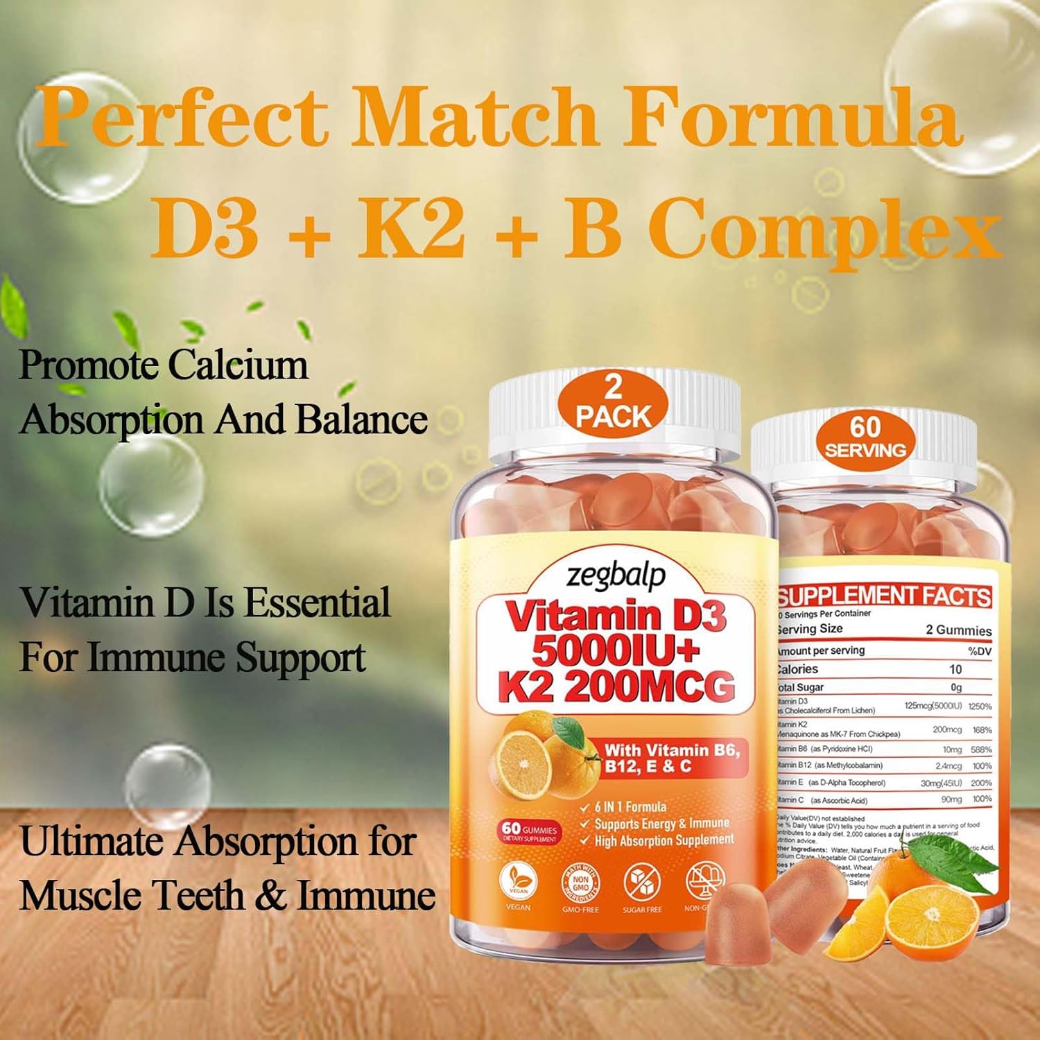 2Packs Vitamin D3 K2 Gummies for Adults, Sugar-Free Vitamin D3 5000IU + K2(MK-7) 200mcg Supplement with Vitamin B Complex & Vitamin C E Supports Bone, Muscle, Teeth & Immune, Vegan, Gluten Free