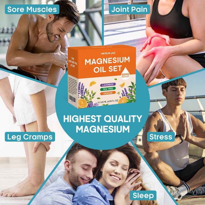 3 Bottles Magnesium Oil Spray Set by Venture Pal – Lavender, Orange, Tea Tree – 100% Pure Topical Magnesium Chloride for Feet, Organic Natural from Dead Sea