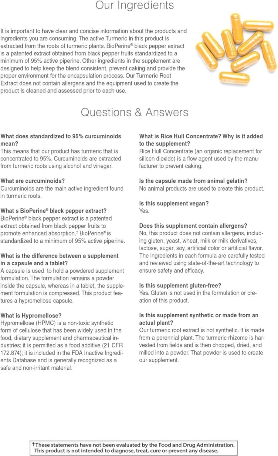 Supplement your health with the Spring Valley Turmeric Curcumin with Ginger Powder General Wellness Dietary Supplement Vegetarian Capsules. This general wellness supplement may promote cardiovascular, immune, joint, and skin health, as well as a healthy inflammatory response.* The suggested adult dosage is one vegetarian capsule daily, preferably with a meal. These capsules contain no gluten, yeast, milk and milk derivatives, lactose, soy, or sugar and are free of artificial colors or flavors. You can rest assured that Spring Valley Turmeric Curcumin with Ginger Powder General Wellness Dietary Supplement Vegetarian Capsules are produced with strict quality guidelines and are backed by our quality guarantee.