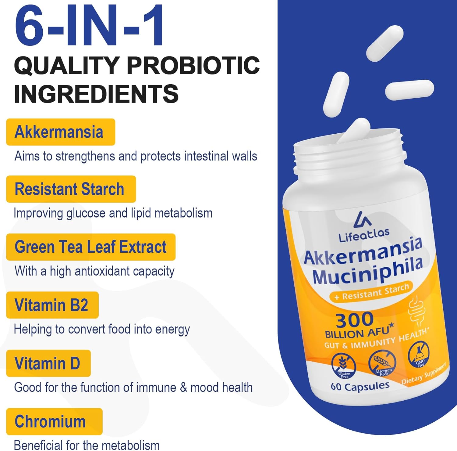 ✅Why Choose Lifeatlas Akkermansia: Our 300 billion AFU Akkermansia probiotic is designed with delayed-release technology to allow the probiotics to survive stomach acid and reach the gut. Our probiotics come in shelf-stable bottles, in slow-release capsules to ensure the probiotics are active and effective. Shelf-stable, Non-refrigerated, vegan probiotic, 60 capsules for 30-day supply. 100% MONEY BACK SATISFACTION GUARANTEE.