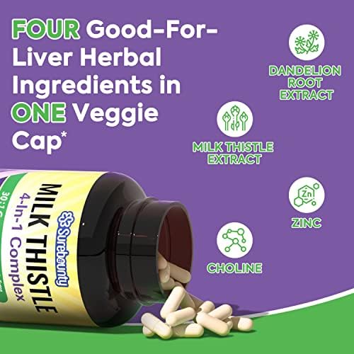 Quadruple Strength Liver Formula: Surebounty 4-in-1 Milk Thistle Complex delivers 300 mg of 30:1 milk thistle extract, equivalent to 9000 mg of raw herb per veggie capsule.* This extract is highly concentrated and standardized to 80% silymarin for improved bioavailability and optimal absorption.* Our formula also features a liver-supportive blend of dandelion extract, choline & zinc.* Take ONE capsule daily, Feel Refreshed and Invigorated with Surebounty 4-in-1 Milk Thistle Complex.*
