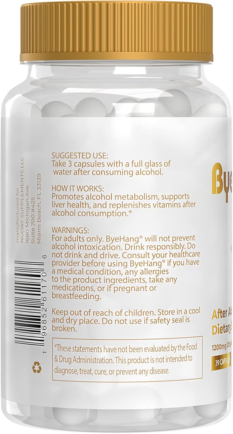 Enjoy a productive next day after drinking: ByeHang is a product formulated by Board Certified Doctors of Pharmacy that combines natural ingredients like dihydromyricetin (DHM), vitamins, herbals, and amino acids to replenish the body with essential nutrients after alcohol consumption. Milk Thistle, Ginger, Prickly Pear, L-theanine, and L-cysteine are involved in free radical scavenging and antioxidant activities to promote optimal wellbeing after drinking alcohol.*