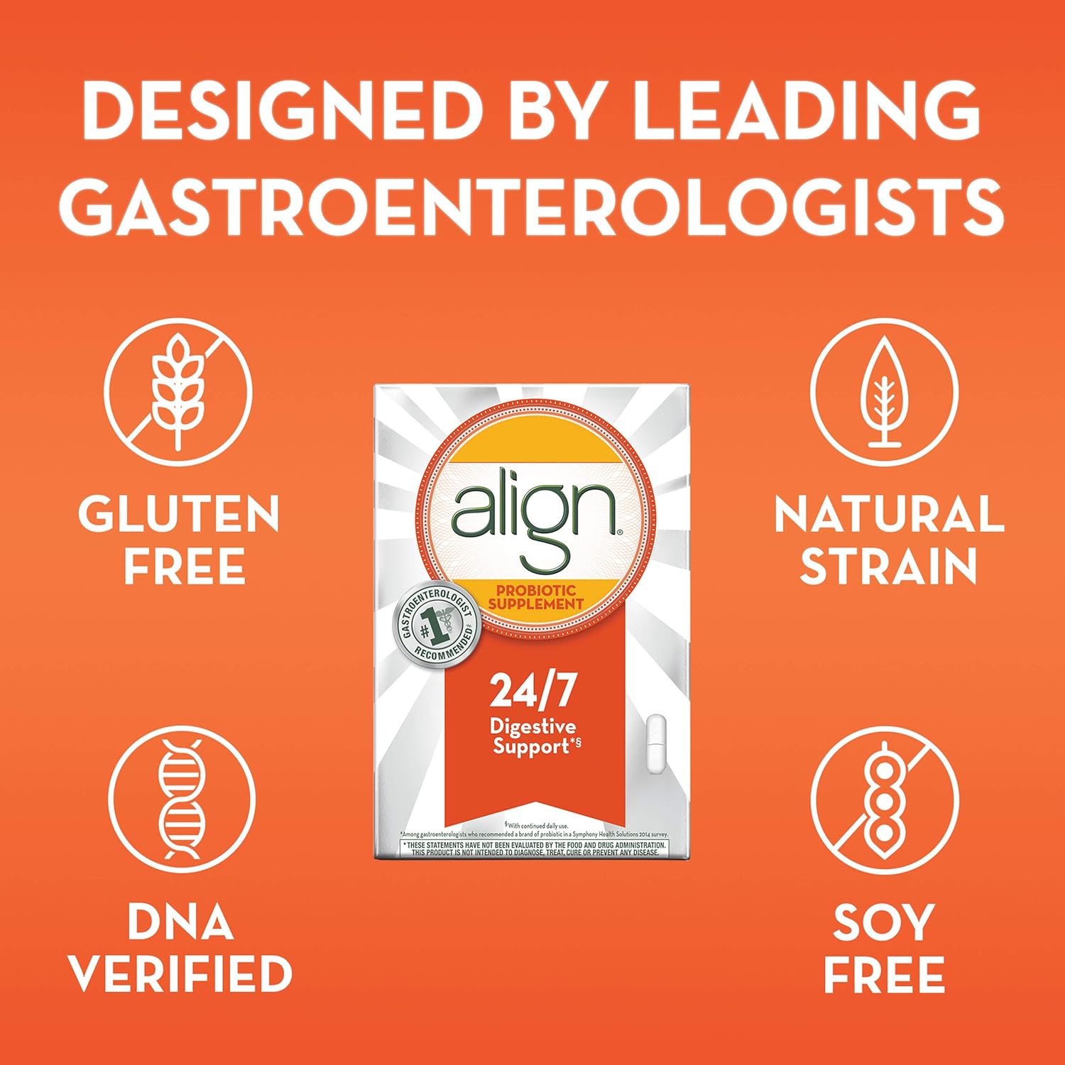 THE PROBIOTIC BRAND DOCTORS RECOMMEND MOST‡. Recommended by Gastroenterologists two times more than any other probiotic, Align daily probiotic supplement is the #1 doctor and gastroenterologist recommended probiotic brand‡. Good bacteria are essential for many bodily functions, including healthy digestion. However, common issues such as diet, travel and stress can disrupt the natural balance of bacteria in your digestive system. Discovered by Gastroenterologists and backed by 20+ years of research, Align Probiotic contains the unique strain Bifidobacterium 35624 and naturally helps soothe occasional abdominal discomfort, gas, and bloating*. Taking one capsule a day helps to maintain your digestive system’s natural balance. Align Probiotic is vegetarian, gluten-free, soy free and no refrigeration is required. *THESE STATEMENTS HAVE NOT BEEN EVALUATED BY THE FOOD AND DRUG ADMINISTRATION. THIS PRODUCT IS NOT INTENDED TO DIAGNOSE, TREAT, CURE, OR PREVENT ANY DISEASE ‡Among Doctors and Gastroenterologists who recommended a brand of probiotic in ProVoice 2021 survey