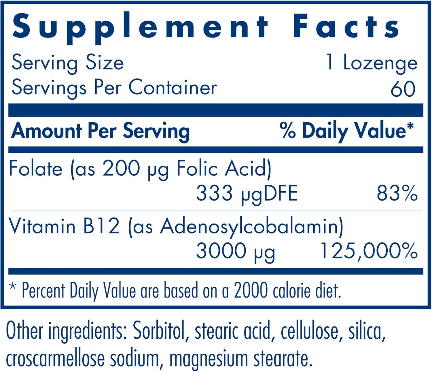 Allergy Research Group B12 Adenosylcobalamin Supplement – with Folic Acid, Vitamin B12 3000 mcg, Folate, Pure B12, Vegetarian Lozenges – 60 Count