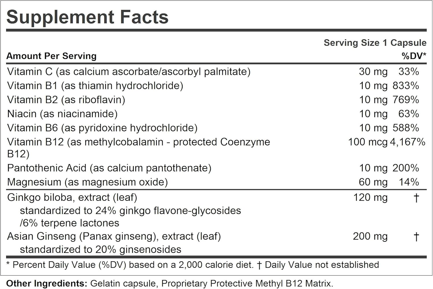 SUPERIOR Pure BIO-ACTIVE INGREDIENTS – Delivers tested and validated extracts to meet the “clinical standard”. Provides 120 mg of Ginkgo biloba extract, 200 mg of ginseng extract, B-complex vitamins, Vitamin C and magnesium. Contains NO Milk / Dairy-Free, Gluten-Free; NO soy, yeast, wheat, sodium, salt, sugar, fat, cholesterol, color, preservative, common allergens or manufacturing additives.