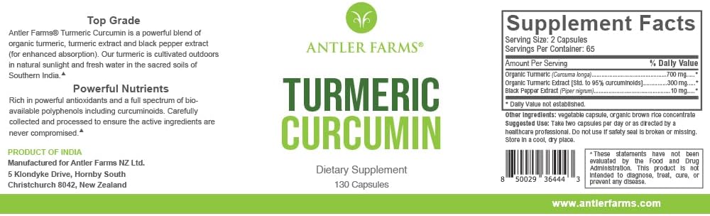 FUNCTIONAL BLEND – Antler Farms Turmeric Curcumin is a synergistic blend of 100% pure organic turmeric, standardized turmeric root extract, and black pepper extract. Together these ingredients work in concert to yield faster results and greater benefits.