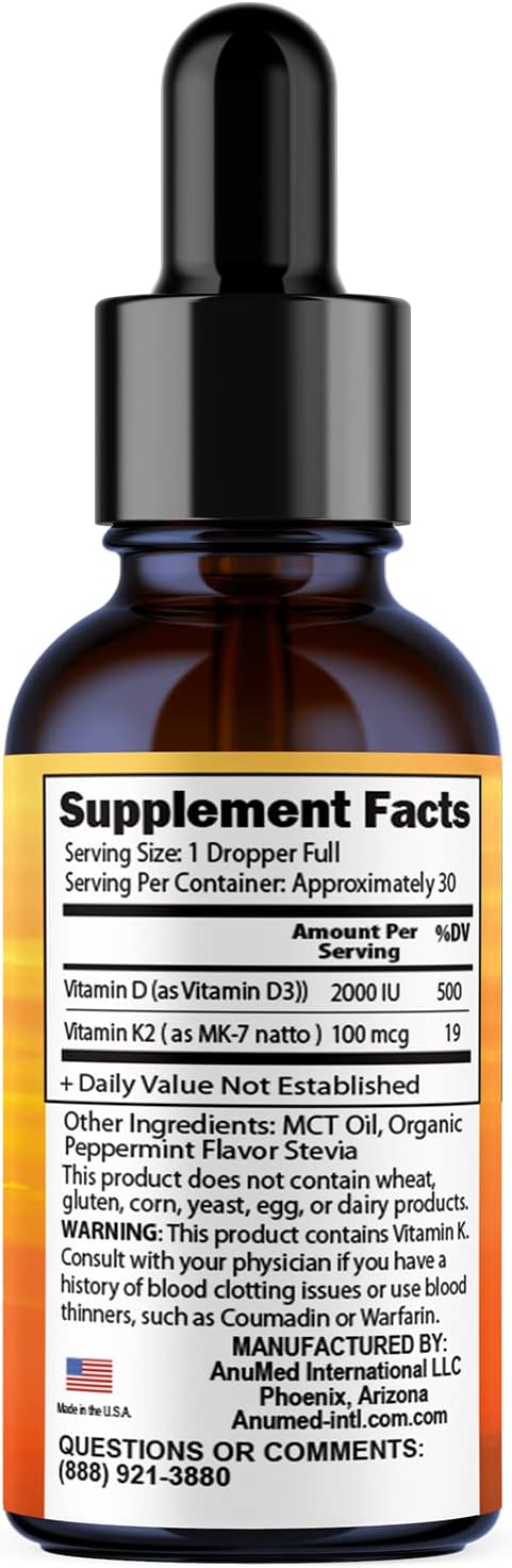 ANUMED – (2-Packs) Vitamin D3 + K2 2000 IU Per Drop with MCT Oil. Promotes Healthy Heart, Stronger Bones, Joints, Muscles, Respiratory System. Non-GMO, Gluten-Free, No Sugar Added, 100% Vegan (1oz)