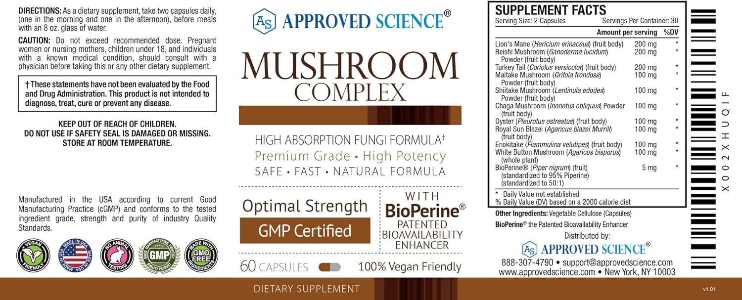 Approved Science Mushroom Complex – Support The Immune System and Cognitive Function – with Lion’s Mane, Chaga, Reishi, Turkey Tail, Shiitake, Oyster, and More – 6 Month Supply – Vegan