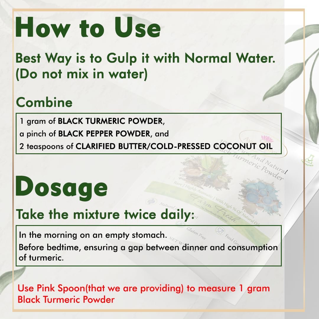 USAGE:- Please take 1 spoon (pink spoon) that We packed that is 1 gram black turmeric powder with a pinch of black pepper powder plus 2 teaspoons of Clarified Butter/Cold Pressed Coconut oil TWICE A DAY. Please take it Empty Stomach in the morning and Before going to bed (so there will be a gap between dinner and taking turmeric. Best Way is to Gulp it with Normal Water. (Do not mix in water)
