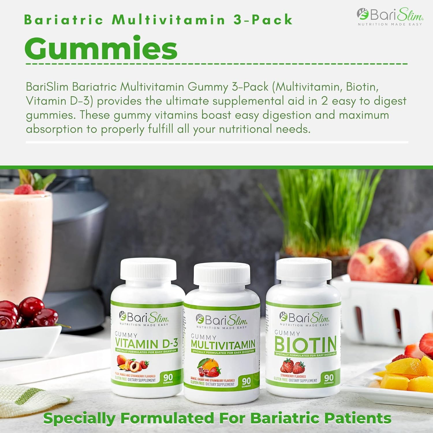 BariSlim Bariatric Multivitamin Gummies – Specially Formulated Gummy Vitamin for Patients After Weight Loss Surgery – Easy to Digest & Great Tasting Fruit Flavors | Pack of 3 (90 Fruit Chews)