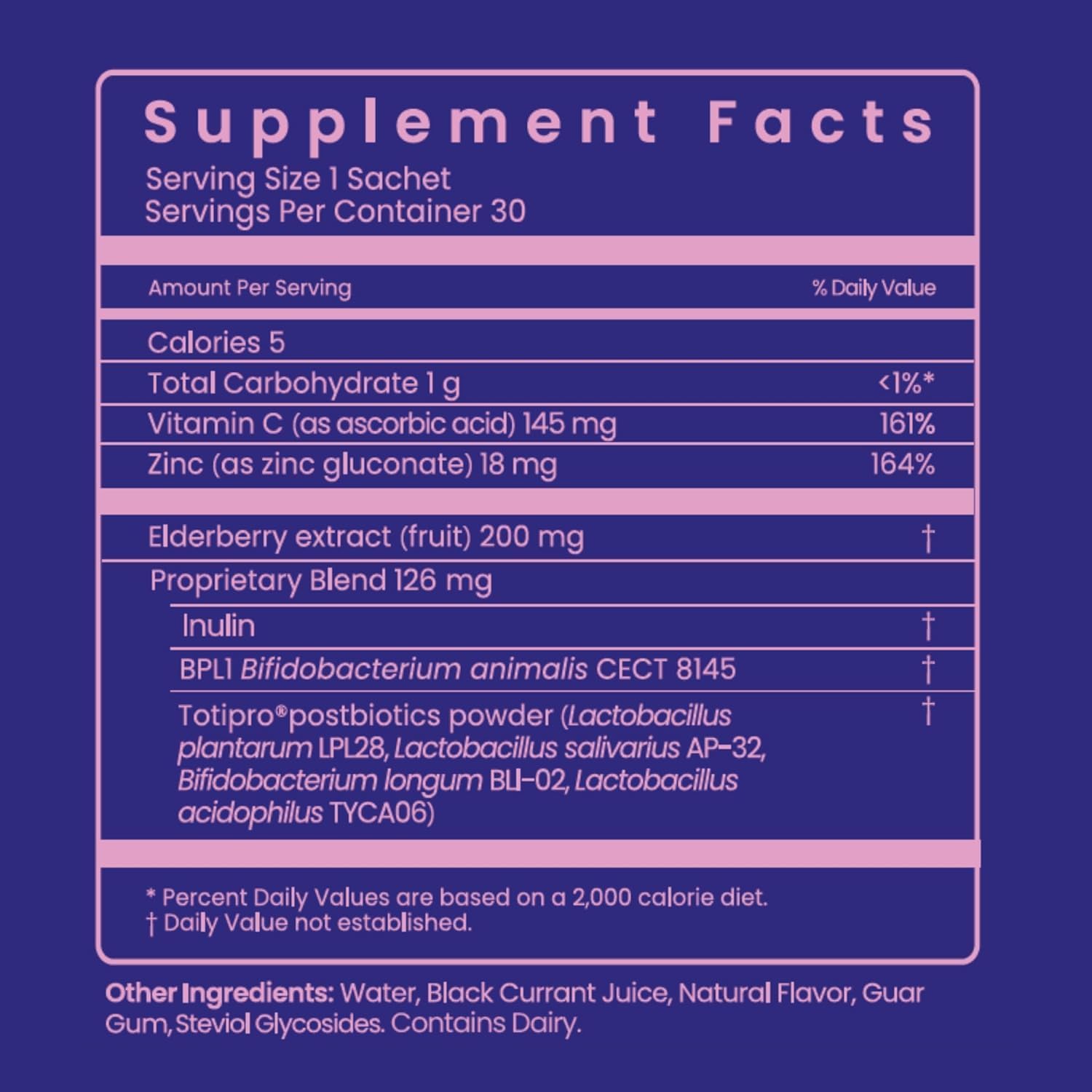 Benefits of Be Healthy: Each sachet is boosted with Inulin, B. lactis, Totipro, Vitamin C, Zinc, and Elderberry. Inulin contains fiber-rich chicory root to help regulate bowel movements, while B. lactis and Totipro support overall gut health, reducing discomfort and bloating. Vitamin C, Zinc, and Elderberry are essential for supporting immune function.