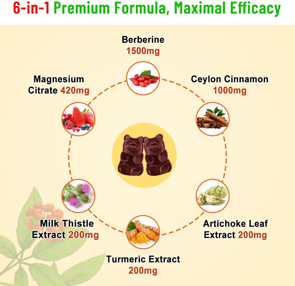 [6-In-1 HIGH PURITY FORMULA]Our Berberine Gummies not only added with 1500mg of berberine HCL extract and 1000mg Ceylon cinnamon but are also rich in 420mg magnesium citrate, 200mg milk thistle, 200mg turmeric extract, and 200mg artichoke leaf extract for a holistic health boost.