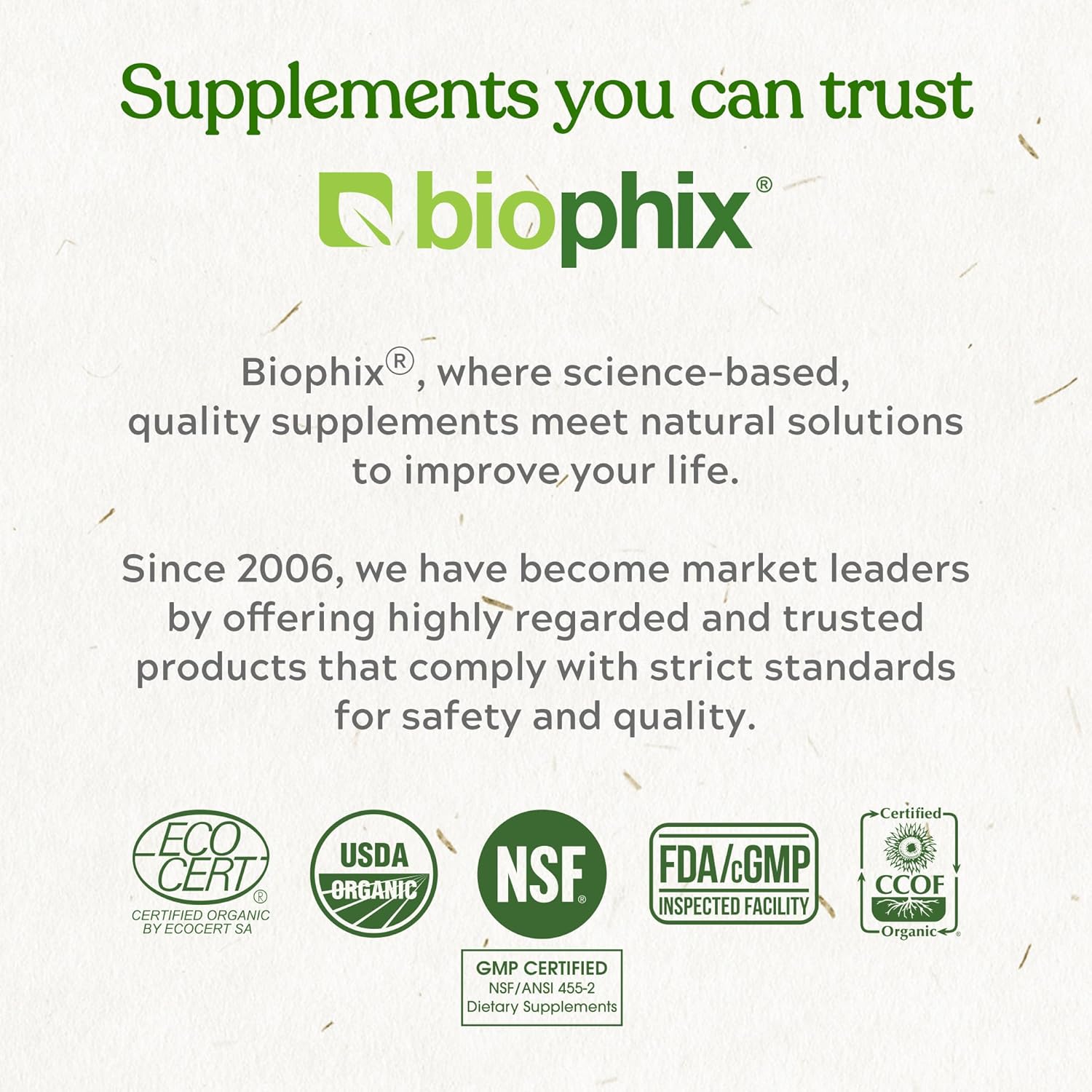Our Biophix team consists of people who are natural explorers, passionate about the healthful ingredients found in nature and committed to finding the most pure and effective combinations backed by research. This great care dedicated to our product formulations, combined with our top notch commitment and scientific research has made Biophix dietary supplements the high quality brand of choice.