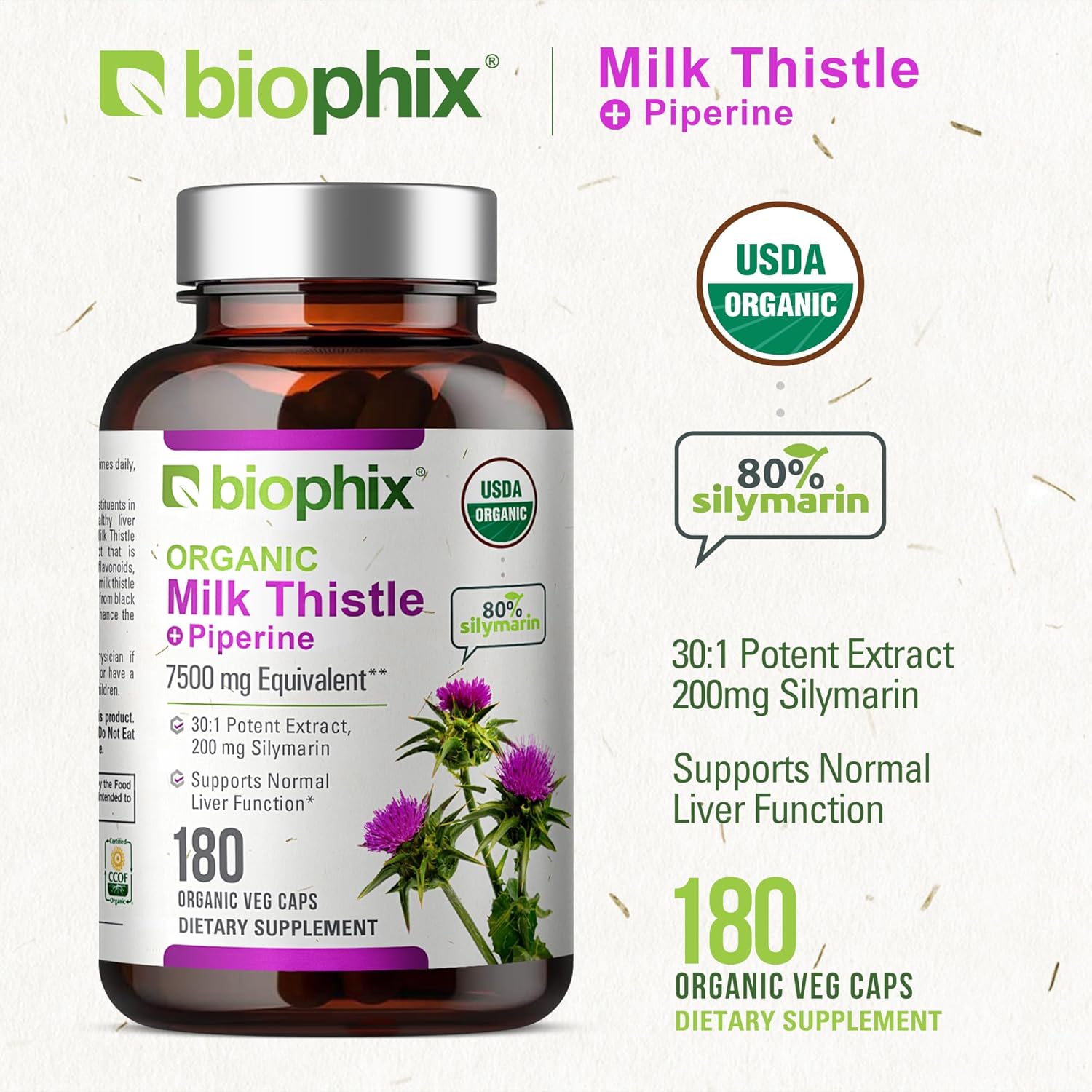 Introducing USDA Organic Milk Thistle! Our Certified Organic Milk Thistle is made using a potent 30:1 extract that is standardized to contain 80% silymarin flavonoids, equivalent in strength to 7,500 mg of milk thistle seeds. But we don’t stop there. We’ve also added Organic Piperine, an herbal extract derived from black pepper, to naturally enhance the body’s absorption of this product. This third party analysis, certified organic formula, delivers a full dose of 200 mg of Silymarin Flavonoids per capsule. Produced under stringent organic standards, our milk thistle is non-GMO, ensuring that it contains no genetically modified organisms. Our organic certification guarantees that every ingredient in our capsules is clean and free from harmful chemicals and pesticides commonly found in non-organic products. This dedication to organic practices means that our milk thistle not only supports your health but also promotes sustainable farming practices, making it a healthier choice for both you and the environment. We pride ourselves on using only the finest Organic Milk Thistle extract, free from unnecessary additives, GMO’s and pesticides, ensuring a clean and wholesome product. Manufactured with care in the USA in our own cGMP certified facility, our product is backed by over 25 years of experience and cGMP certification, assuring strict quality control measures. Rigorous third-party lab analysis ensures purity, potency, and safety, giving you peace of mind with every serving. Soy-free, dairy-free, GMO Free, and suitable for vegans, our formula caters to various dietary preferences and restrictions. Because we believe that everyone deserves access to quality health products, we stand by our commitment to excellence. Trust Biophix Organic Milk Thistle for premium quality and unparalleled support for your health journey!