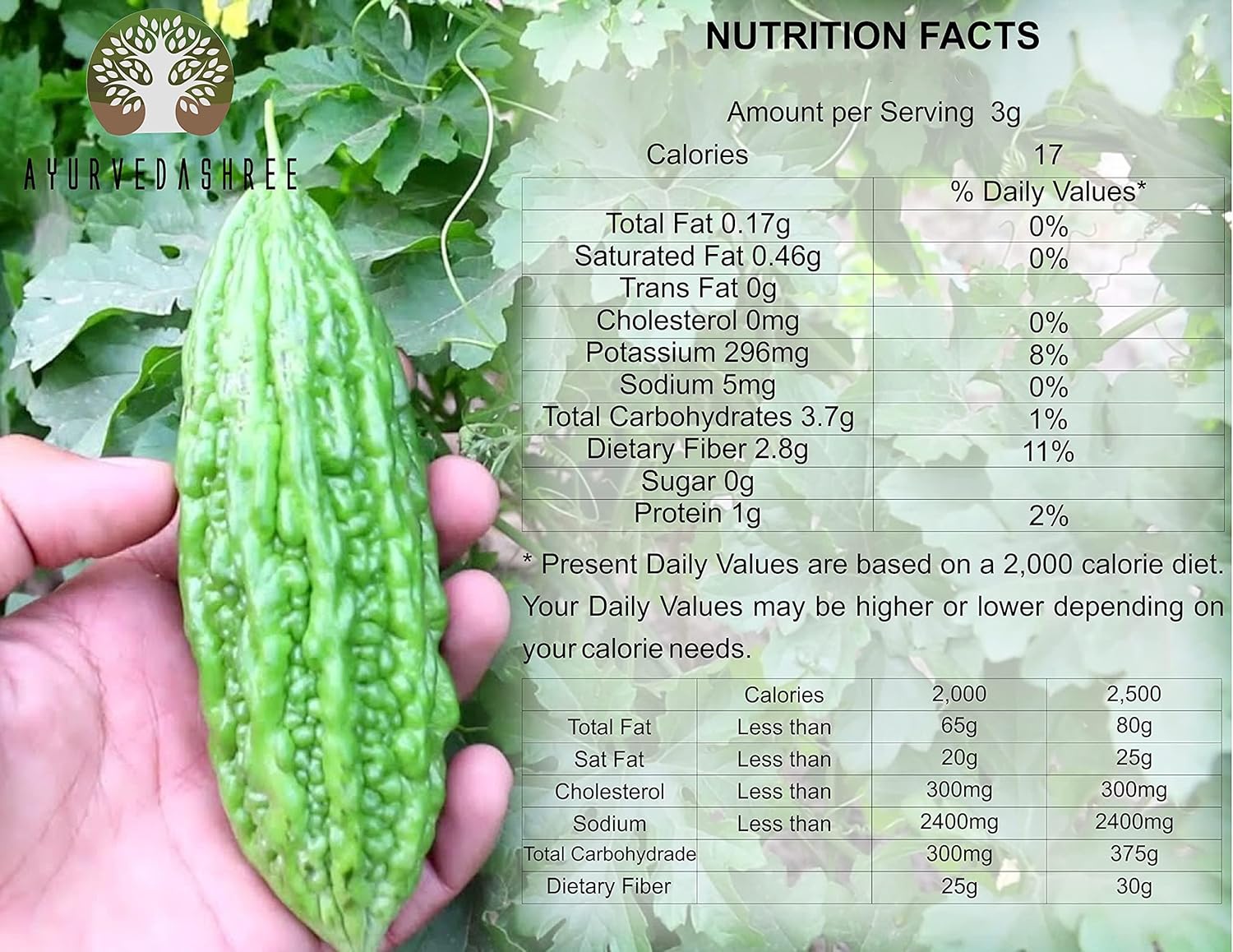 AYURVEDASHREE : Our aim to provide quality products always. We source our raw material from the most natural place of India. Natural with no added chemicals, heavy metals or any other addition which is harmful for anyone in any manner. Our products are made under GMP certified manufacturing. All our products are NON GMO and gluten free. Bitter melon powder supports as blood purifier & de-toxifier, promotes improvement of liver functions. Bitters & Alkaloids present in Bitter melon powder, supports healthy pancreatic cells functions. Bitter melon powder considered to be useful For skin . Lab tested for quality, Non-GMO, vegan & gluten free