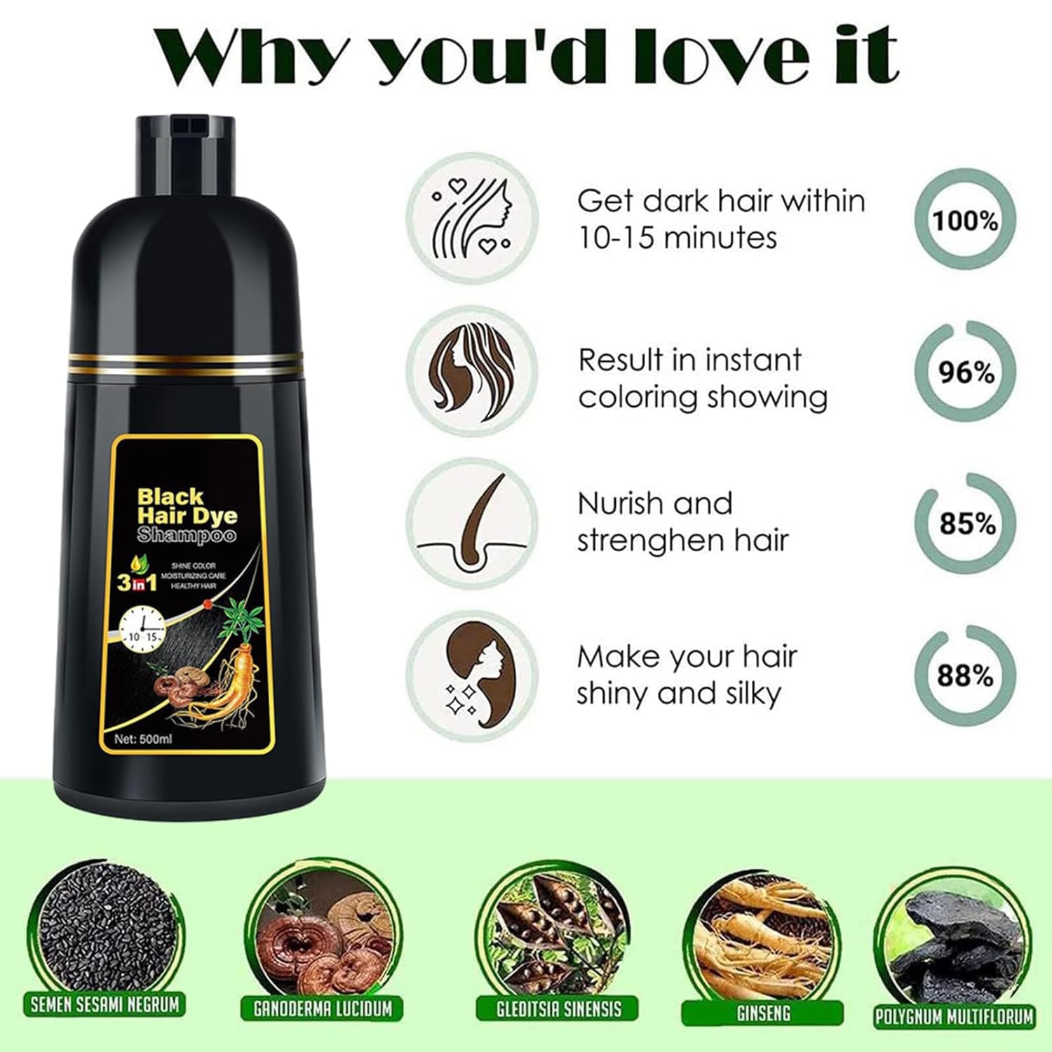 ✨【NATURAL HERBAL FORMULA INGREDIENT】: Shampoo dye Hair Color,Magic Hair dye shampoo contains Natural and mild herbal polygonum extract will strengthen the hair fibers from inside to out and Ginseng extract deeply nourish your scalp with effective hair repair effect, leaving your hair shiny, soft and smooth. Natural black hair lasts for more than 3 weeks. without any side effect, anti-allergic and non-irritating to avoid any stimulation or damage to your hair.