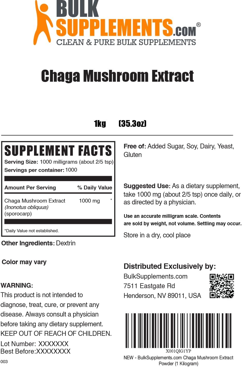 Chaga Mushroom Extract, in powdered extract form, by BulkSupplements.com is one of our herbal supplement selections. Our Chaga Mushroom Extract powder is sourced from the Chaga mushroom, Inonotus obliquus. Each serving of this product contains 1000mg or 1g of Chaga Mushroom Extract, which is about 1/3 tsp and an accurate milligram scale may be required to measure. We also sell this product in a variety of different sizes, ranging from 100g to 5kg in resealable bags. Contents of this product are sold by weight, not volume and settling may occur. Our Chaga Mushroom Extract powder, or Chaga Extract powder, is pure, natural and does not contain any fillers, additives, or artificial flavors. And this Chaga Mushroom Extract, or Chaga Mushrooms powder is dairy free, gluten free, soy free, yeast free, and contains no added sugar. All products by BulkSupplements.com are manufactured according to cGMP Standards to ensure the highest quality for manufacturing, packaging, labeling, and holding operations. We work with a third-party laboratory to test our products at multiple stages during production, from raw material to finished products, and ensures compliance, standards, and consistency.