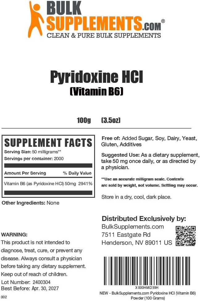 BulkSupplements.com Pyridoxine HCl Powder – Vitamin B6 Supplement, Vitamin B6 50mg – for Immune Support, Gluten Free, 50mg of Pyridoxine B6 per Serving, 100g (3.5 oz) (Pack of 1)
