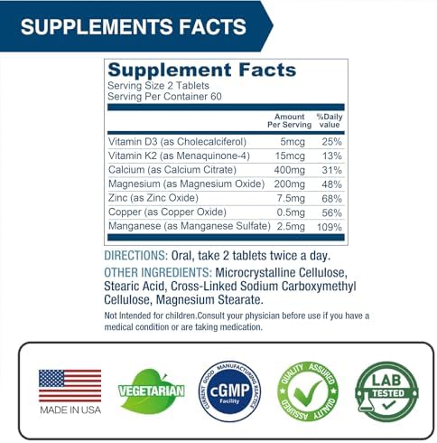 Calcium 800 mg, Complete Bone Formula. Calcium Citrate with Vitamin D3 & K2, Magnesium, Zinc, Copper, Manganese, Vegan Calcium Supplement for Bone Health, 120 Tablets