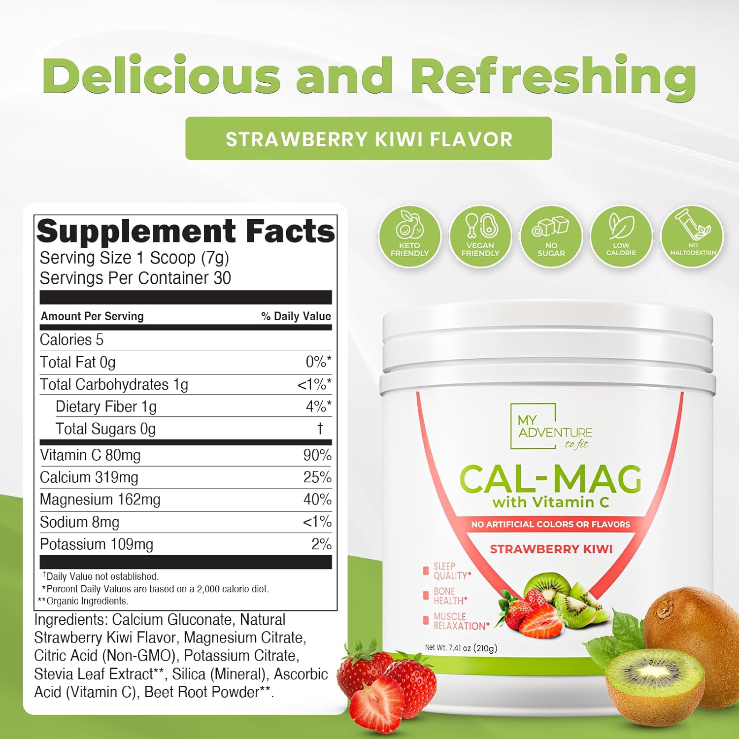 Calcium Magnesium Powder Supplement – Magnesium Calcium Carbonate Powder for Strong Bones – Natural Magnesium Powder for Sleep Quality – Magnesium Citrate Powder (Strawberry Kiwi,30 Servings)
