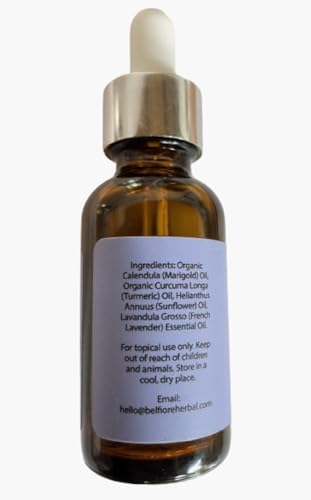 Powerful Herbal Blend: Our calendula and turmeric oil tincture is carefully formulated to harness the combined benefits of these two potent herbs. Calendula is an excellent choice for soothing irritated skin. Turmeric, on the other hand, contains curcumin, a powerful compound with antioxidant and properties that aid in skin recovery