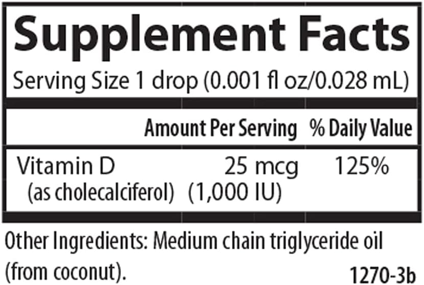 1,000 IU (25 MCG) VITAMIN D3 – A single drop provides 1,000 IU (25 mcg) of vitamin D3 as cholecalciferol. Place a drop in your food or drink.
