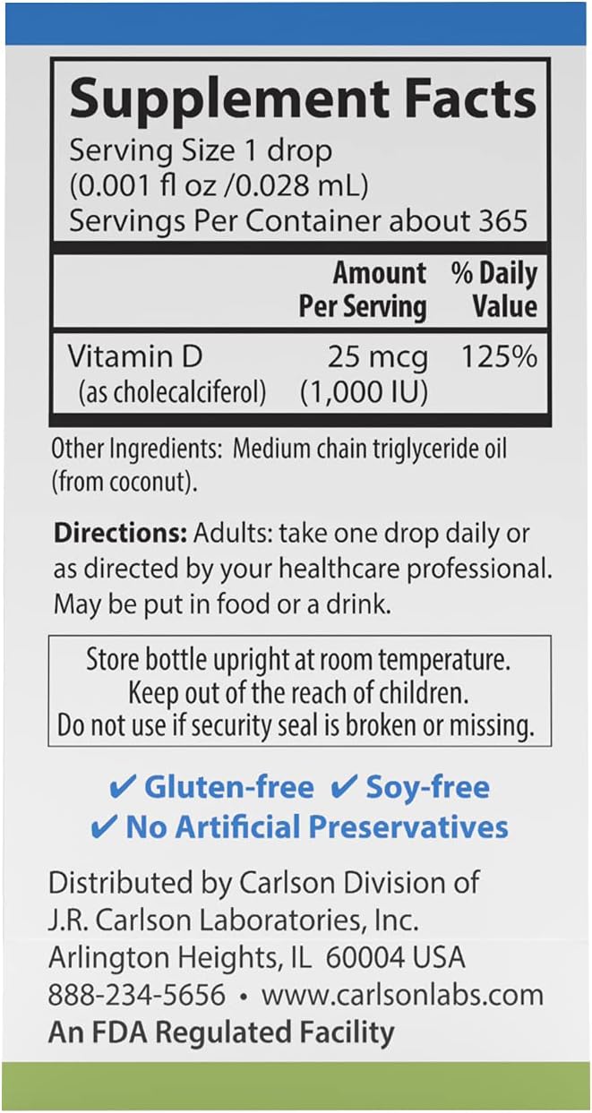 Carlson – Super Daily D3, Vitamin D Drops, 1,000 IU (25 mcg) per Drop, 1-Year Supply, Vitamin D3 Liquid, Heart & Immune Health, Vegetarian, Liquid Vitamin D3 Drops, Unflavored, 365 Drops