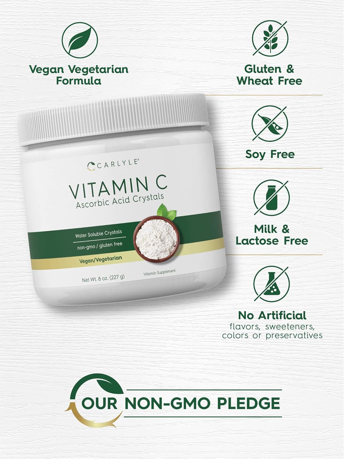 Carlyle Ascorbic Acid Powder | Vitamin C | 8 Ounces | Water Soluble Crystals | Vegan, Vegetarian, Non-GMO and Gluten Free Supplement