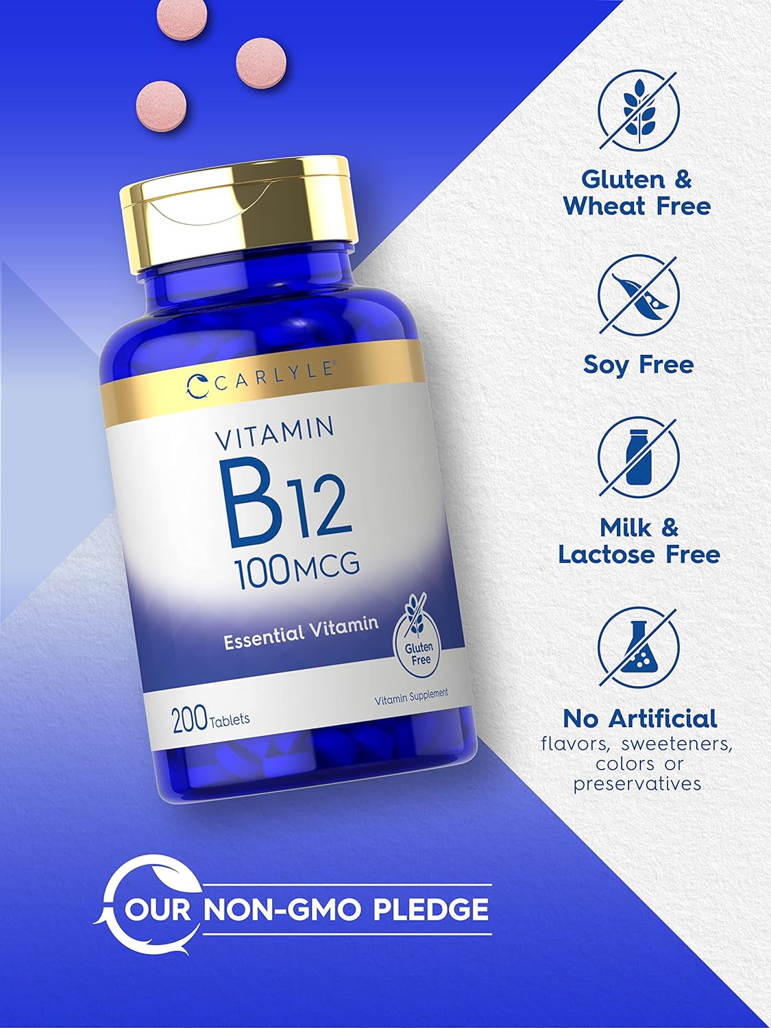 Carlyle Vitamin B12 100mcg | 200 Tablets | Essential Vitamin Supplement | Vegan, Non-GMO, and Gluten Free Formula