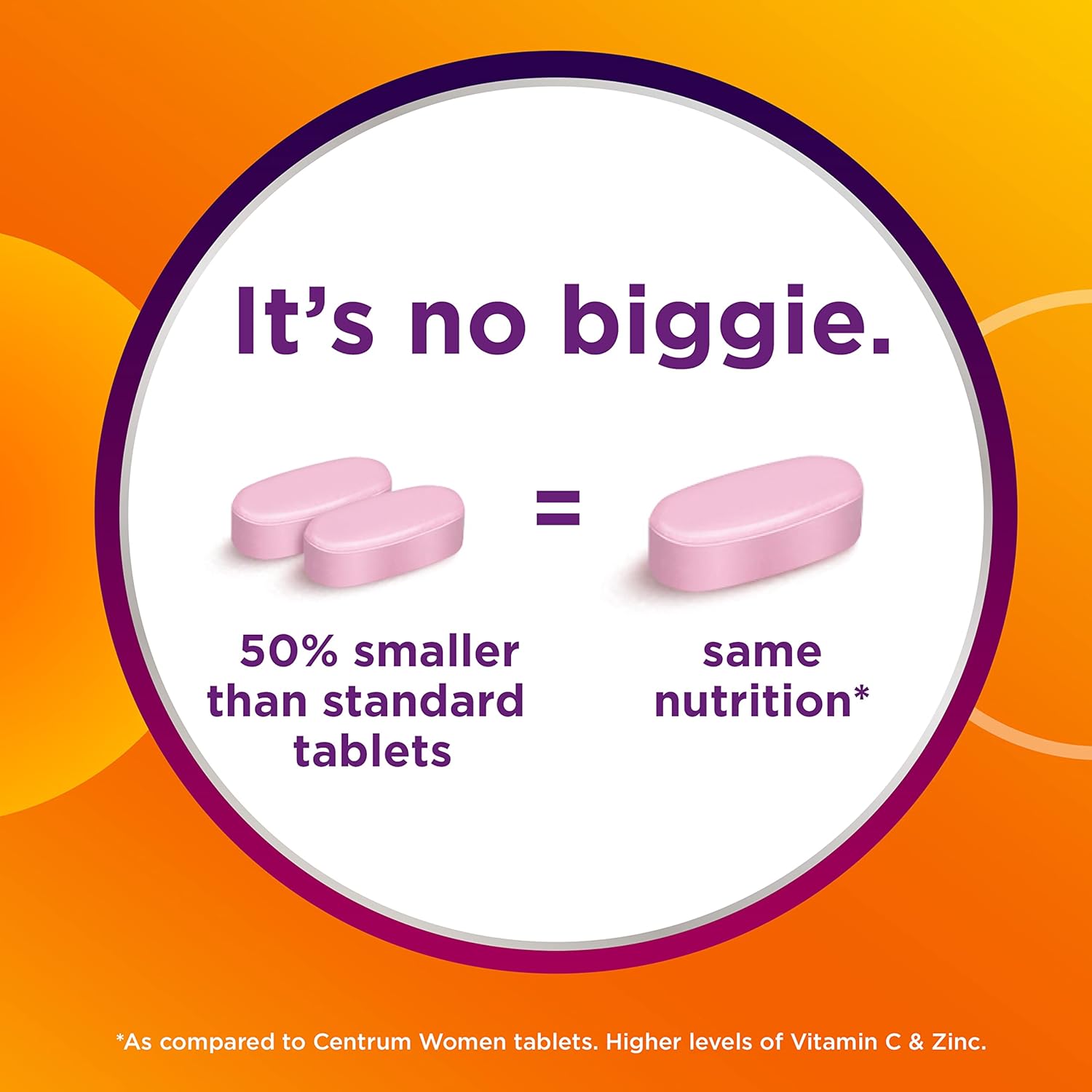 Easy-to-swallow mini immune support (2) supplement tablets are smaller than regular Centrum tablets