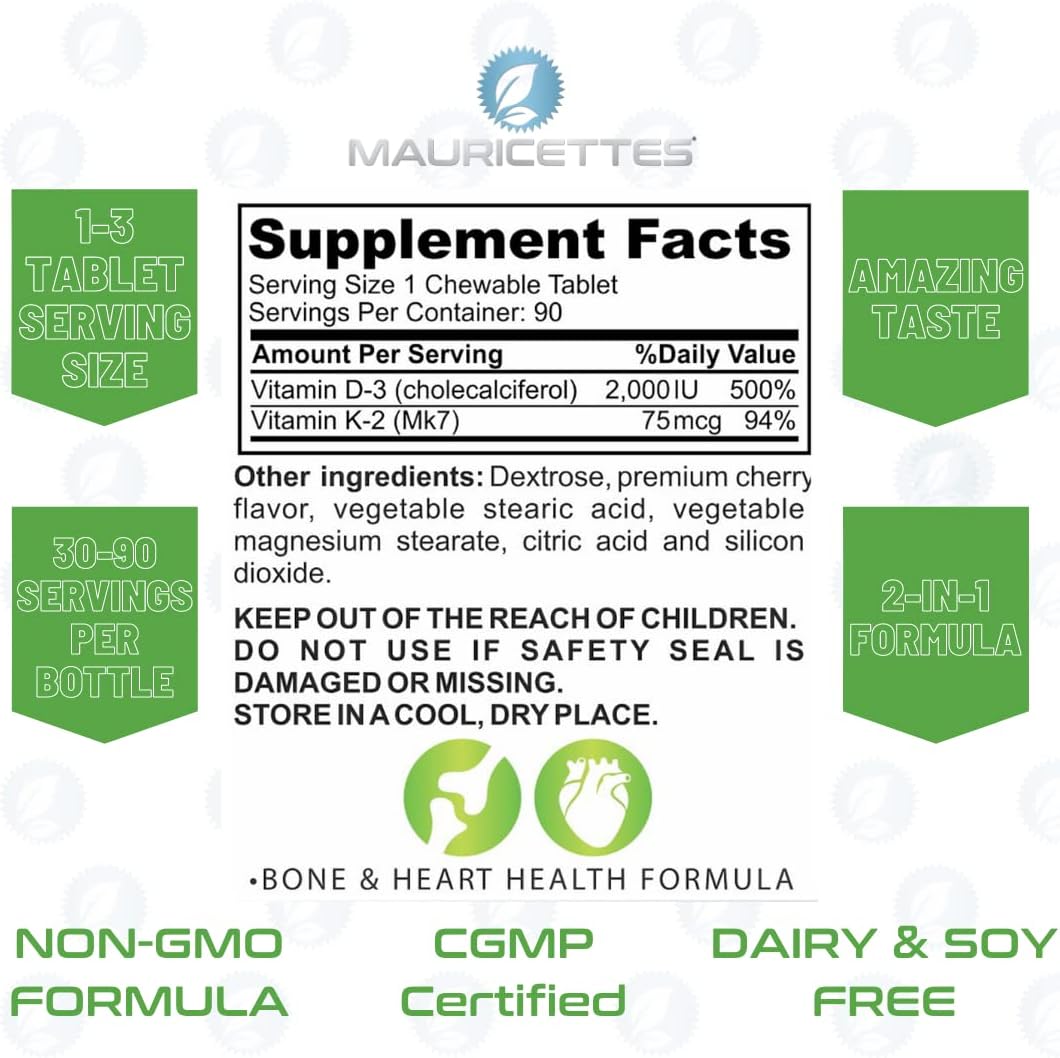 Chewable D3 with K2 – Mauricettes Chewable D3 K2 Vitamin is a 2-in-1 support vitamin supplement that is a powerful combination to help support a happy and active life. From building strong bones and teeth, to boosting your mood and immune system, Mauricettes D3 K2 vitamin does it all with 2000 IU of the best Vitamin D supplement & 75 mcg of Vitamin K supplement.