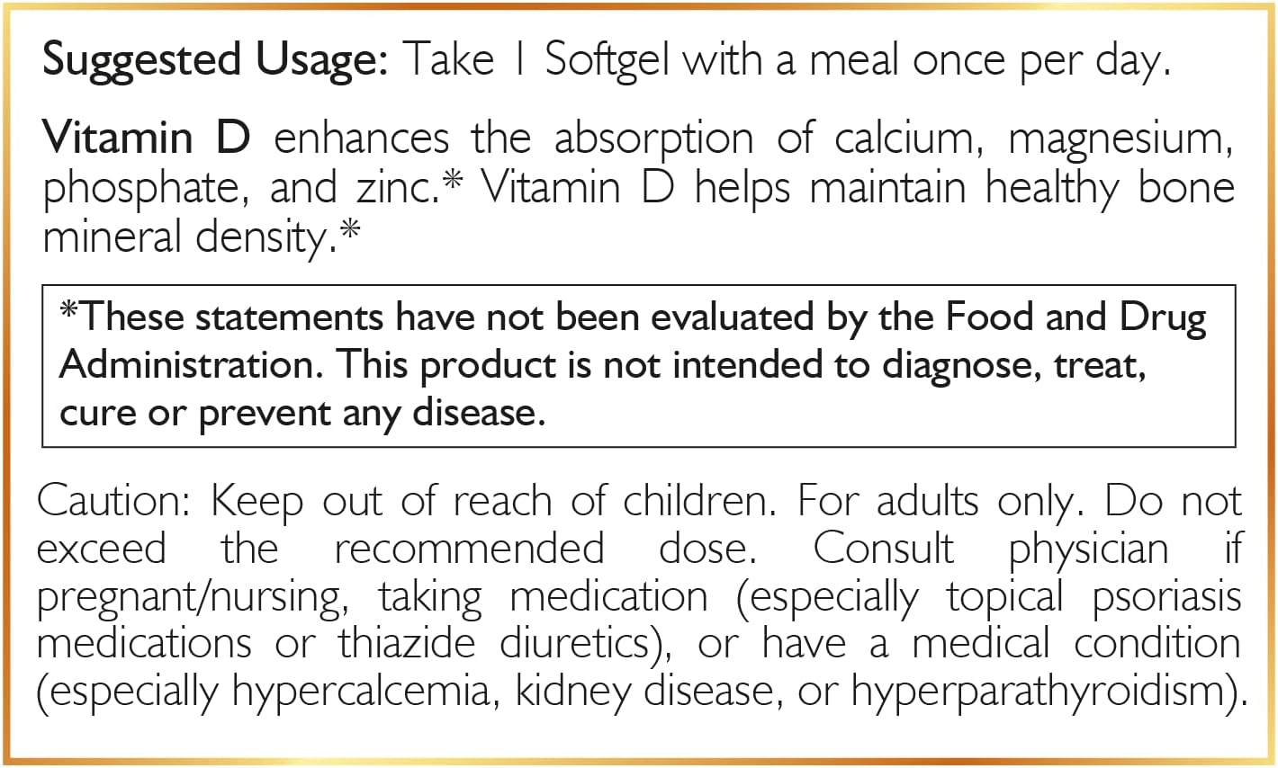 Supports Overall Health: Vitamin D enhances the absorption of calcium, magnesium, phosphate, and zinc. It helps maintain healthy bone mineral density and is beneficial for a healthy cardiovascular system