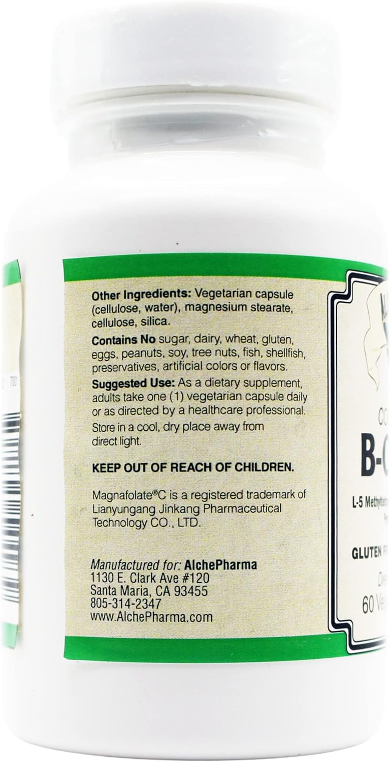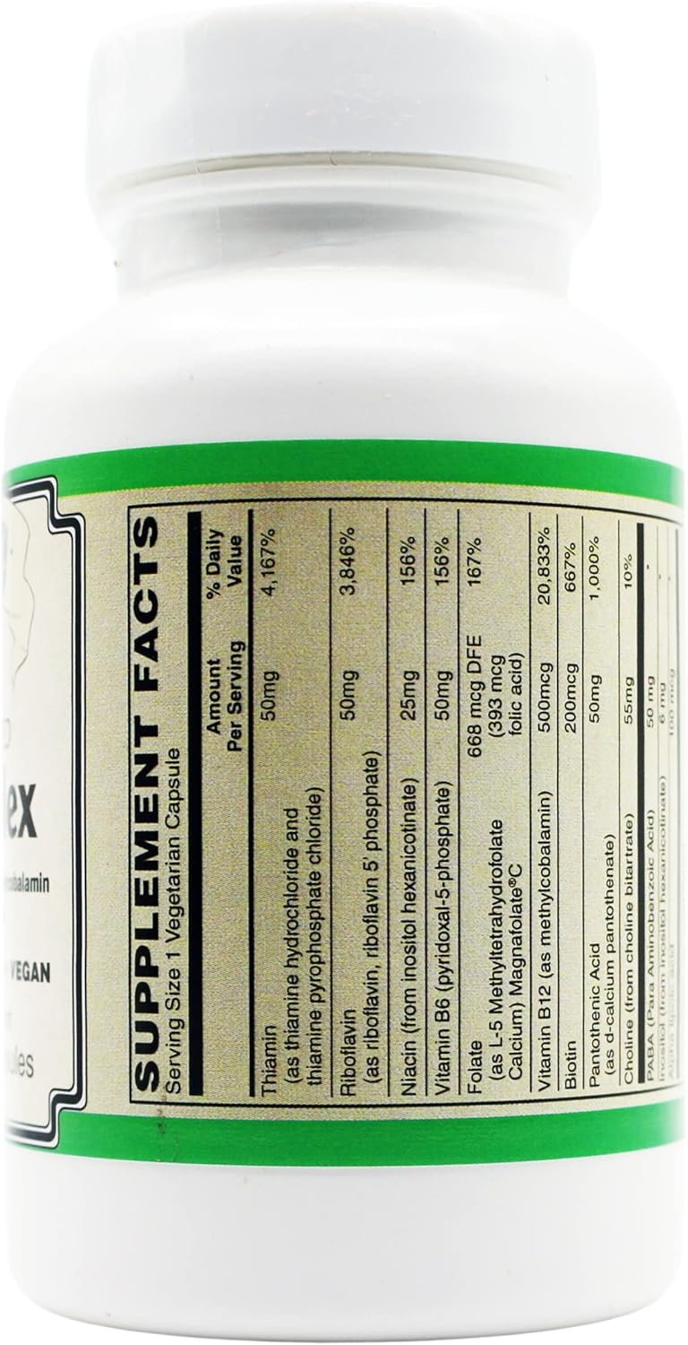 High potency once daily formula contains B-Complex with fully methylated 500 mcg of B-12 (as Methylcobalamin), 668 mcg DFE Folate (as MagnafolateC 5-MTHF) and 50 mg of B-6 (as Pyridoxal-5-Phosphate). Provides effective dose of flush-free Niacin (Inositol Hexanicotinate), Thiamin, Riboflavin, Biotin, Pantothenic Acid and supportive nutrients like Choline, Inositol and PABA. Alpha Lipoic Acid for added antioxidant support Gluten Free, Non GMO and Vegan Contains No sugar, dairy, wheat, gluten, eggs, peanuts, soy, tree nuts, fish, shellfish, preservatives, artificial colors or flavors.