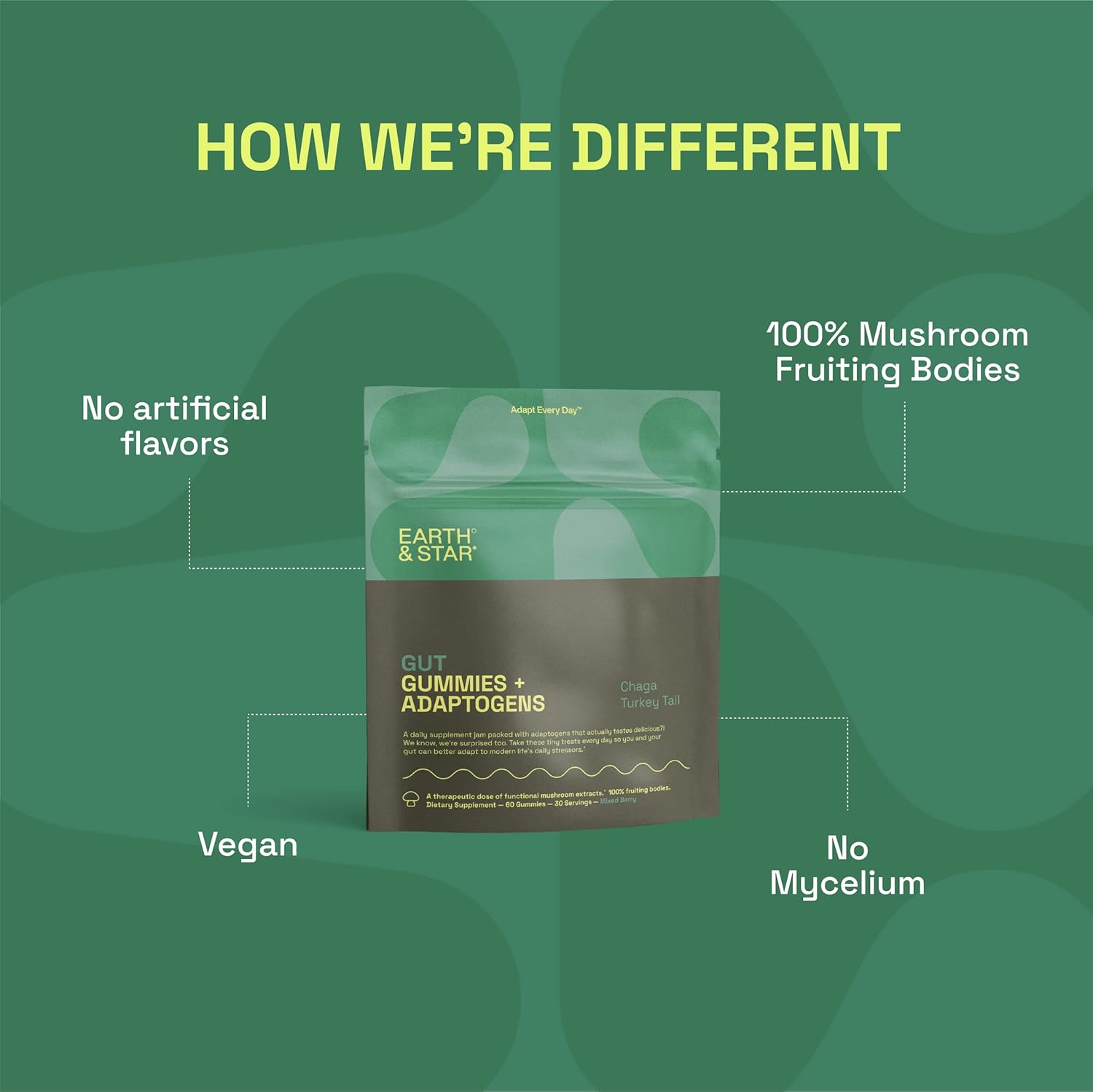 Earth and Star Mushroom Gummies – Gut Support | Chaga and Turkey Tail Mushrooms | Nootropic Mushroom Supplement Boosting Digestive and Gut Health | 60 Gummies