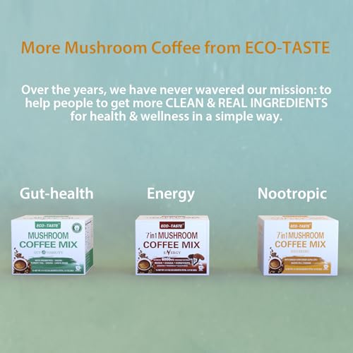ECO-TASTE Mushroom Coffee Mix, Designed for Gut-Health with Chaga, Lion’s Mane, Turkey Tail, Yacon and Probiotics – 12 Sachets