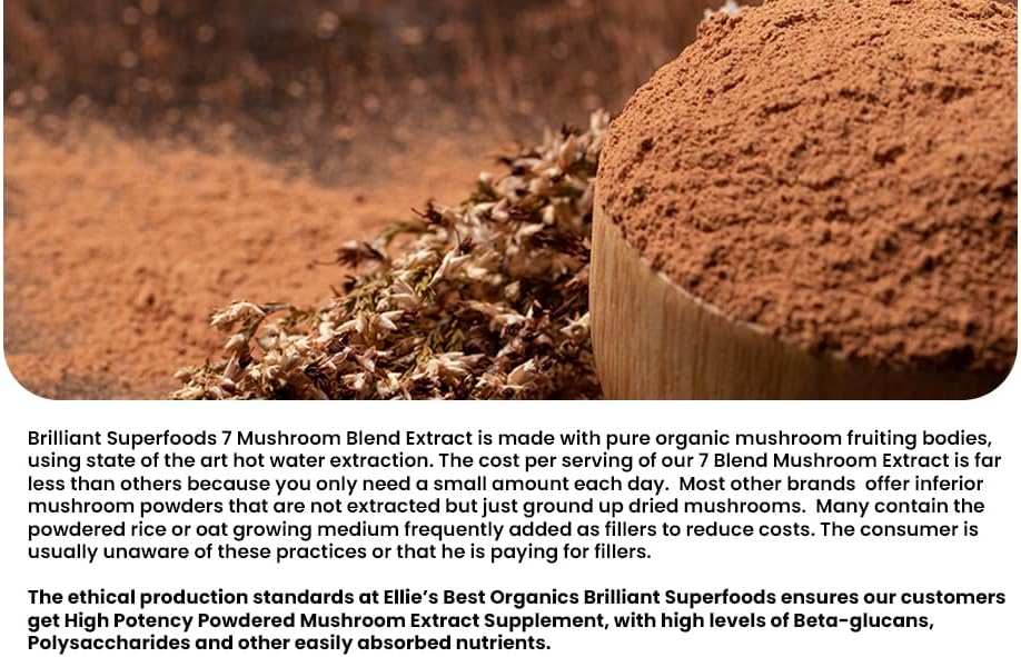 Ellie’s Best 7 Mushroom Powder Extract Blend Supplement Organic 114 Servings High Potency Double Extracted Cordyceps, Reishi, Turkey Tail, Chaga, Lion’s Mane – 4oz