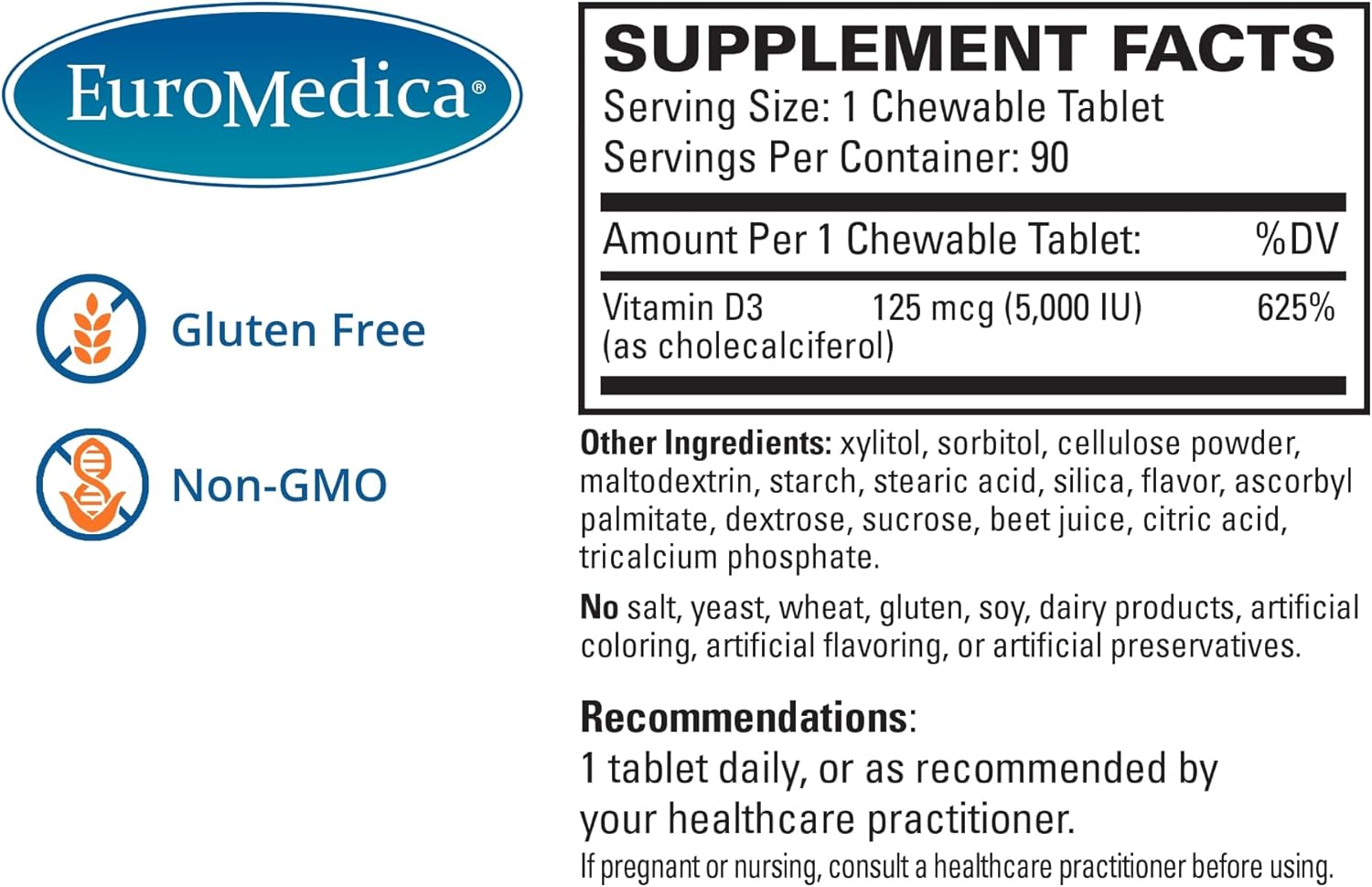 Euromedica Vitamin D3 5000 IU – 90 Chewable Tablets, Mixed Berry – Supports Overall Health, Strong Bones & Teeth + Immune System Function – 90 Servings
