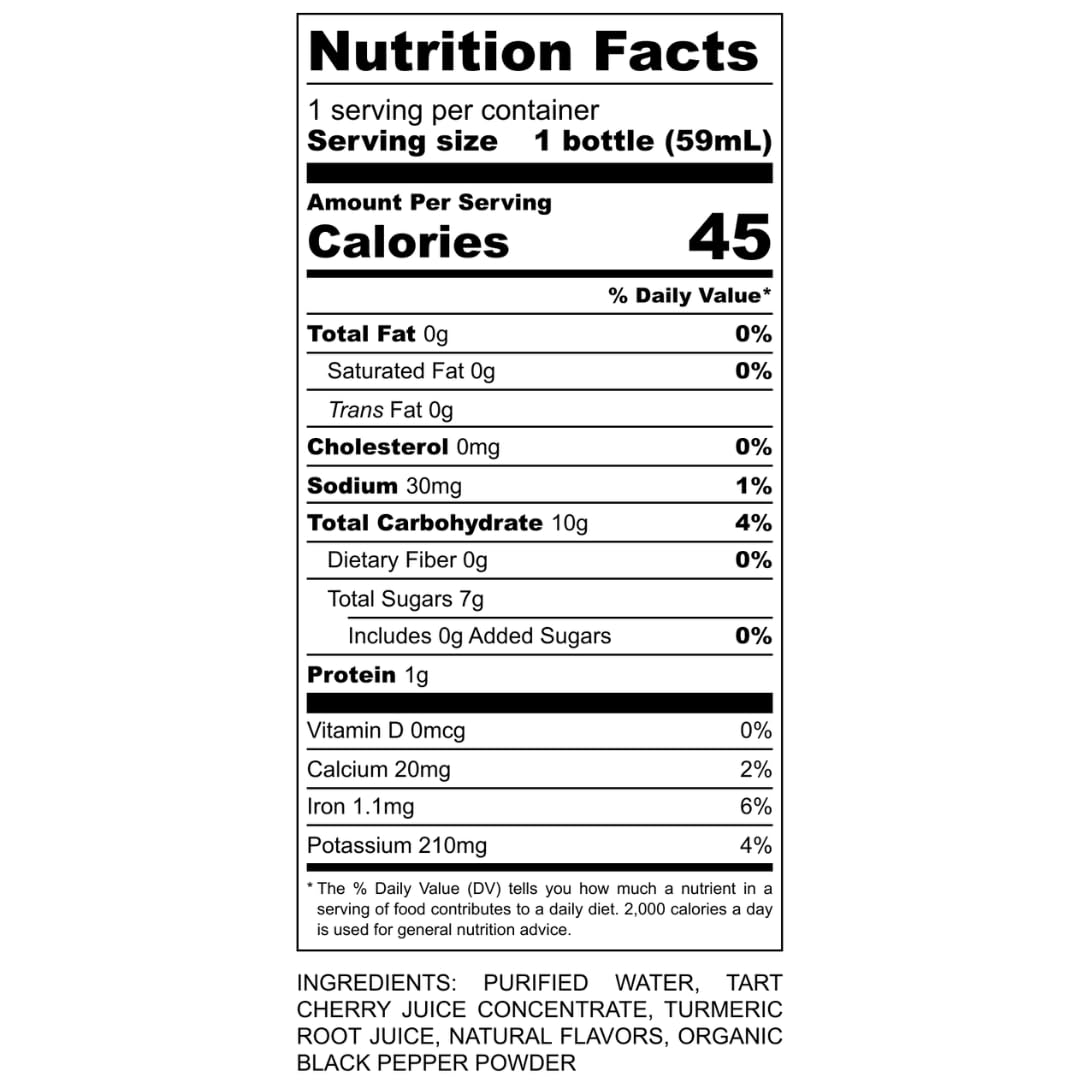 ALL NATURAL INGREDIENTS: Purified Water, Tart Cherry Juice Concentrate, Turmeric Root Juice, Natural Flavors, Organic Black Pepper Powder.