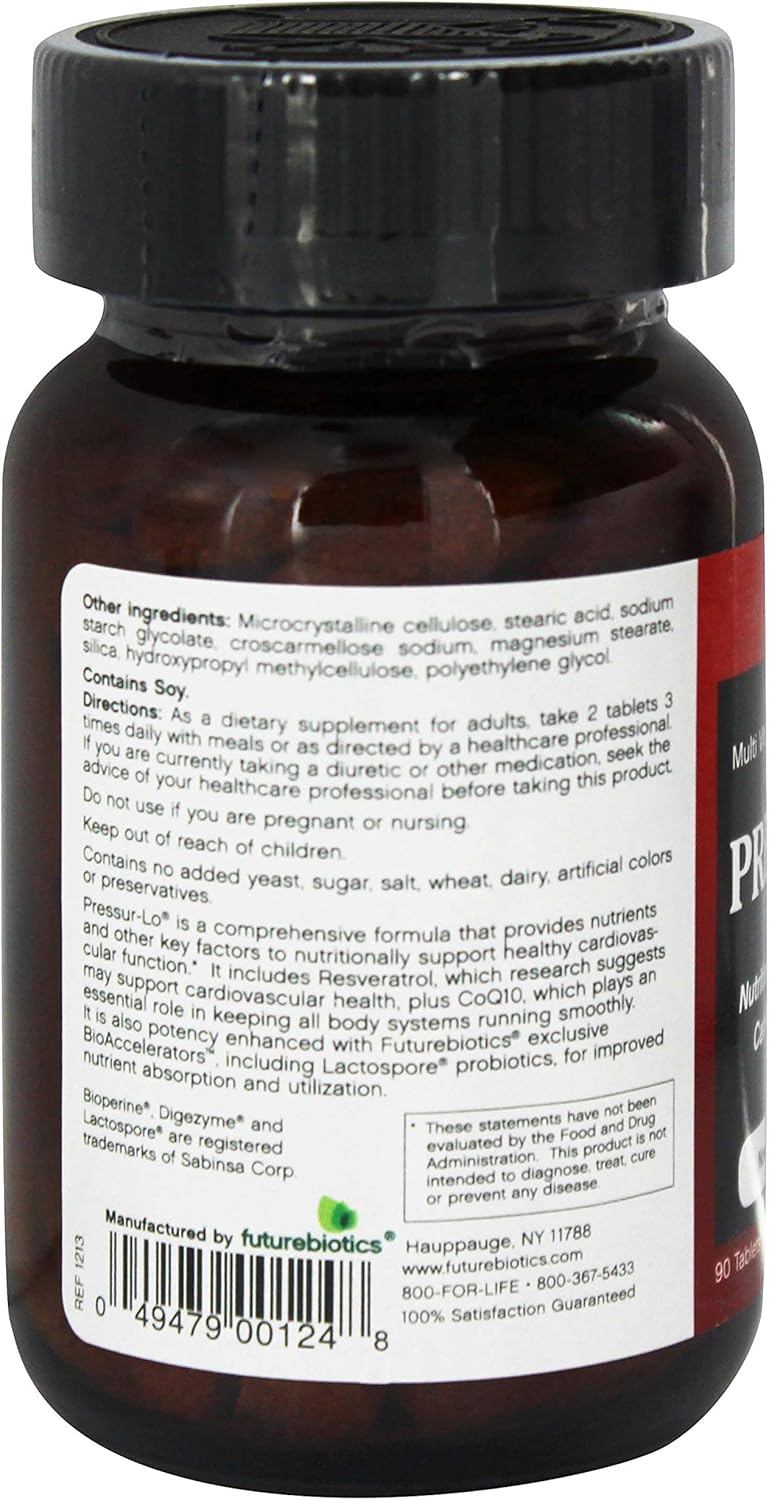 Pressur-Lo is a broad-spectrum formula packed with an array of nutrients, botanicals and other key factors to nutritionally support cardiovascular function, with a particular emphasis on nutritionally supporting healthy blood pressure levels within the normal range.Resveratrol is a naturally-occurring substance found in red wine, which research suggests may play a role in supporting cardiovascular health. Pressur-Lo utilizes Resveratrol from Polygonum cuspidatum, thereby providing the benefits of red wine without consuming alcohol. CoQ10, also known as Ubiquinone, is a vitamin-like compound that plays an essential role in energy production and in keeping all body systems running smoothly. In several studies, CoQ10 has shown a favorable influence on blood pressure with ongoing use and supports heart health.Pressur-Lo includes a comprehensive blend of vitamins and minerals, including Potassium, Magnesium and Niacin (as niacinamide), which research has shown helps support healthy cardiovascular function. It also provides 480 mg of calcium per daily dose, plus a full complement of nutrients such as vitamins A, C, D and many of the B’s, Zinc, Selenium and Chromium. Herbal support is provided with a blend of botanicals historically used to support cardiovascular health, including Garlic, Hawthorn Berry extract and a Beta-Sitosterol complex.Pressur-Lo is potency enhanced with Futurebiotics exclusive BioAccelerators. Clinically-proven Bioperine (Piper nigrum extract) improves nutrients bioavailability, while our proprietary natural compound of Lactospore probiotics, Ginger root extract, Trikatu and super-potent Digezyme digestive enzymes help boost digestion and nutrient absorption.Glass packaging extends natural freshness and helps maintain product potency.