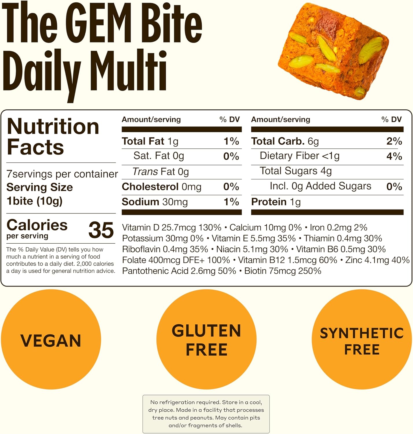 MORE NUTRIENTS: In addition to the daily essential vitamins found in traditional multivitamins, GEM also provides powerful science-backed nutrients like beta-glucan, prebiotics and probiotics for truly holistic nutrition in one delicious Bite.