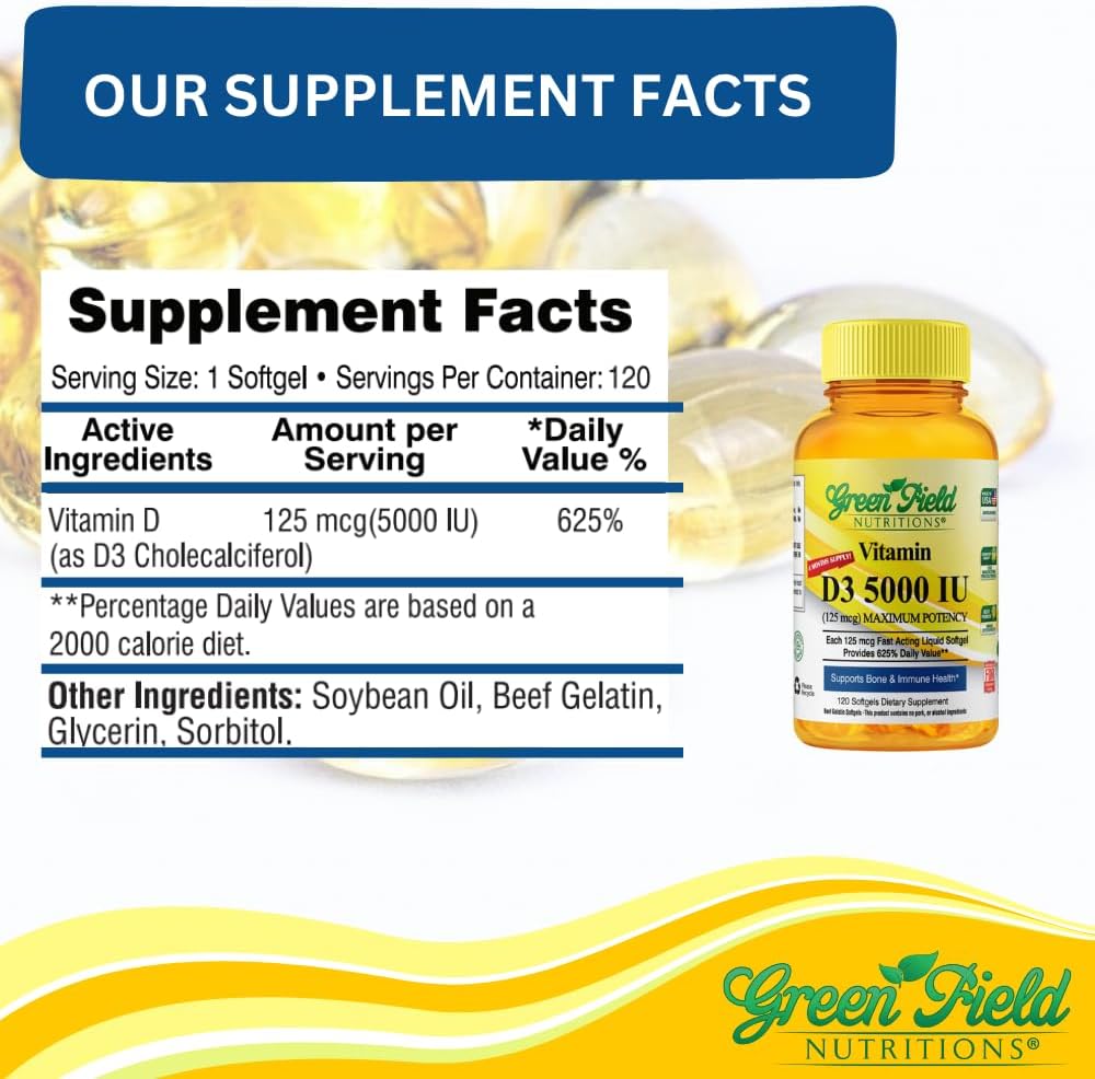 Greenfield Nutritions HALAL VITAMIN D – Halal Vitamin D3 5000 IU Softgel (125 mcg), High Potency 120 Unflavored Softgels – Beef Gelatin D3 Halal Vitamins, Supports Immune Bone Teath Brain and Hair