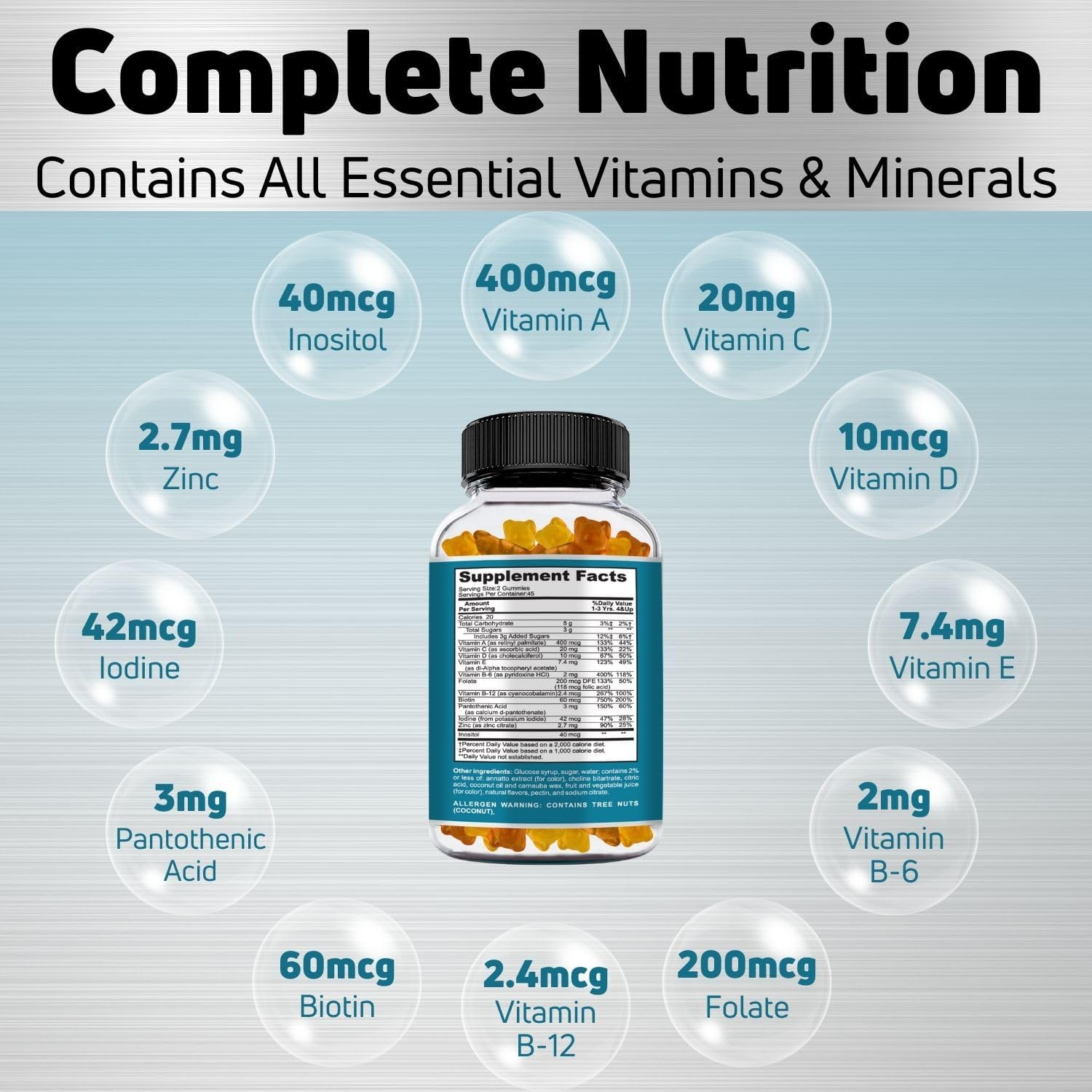 👌 TOTAL CHILDHOOD WELLNESS: Our children multivitamin gummies come with Vitamin A, C, D, E, B6, B12, Folate, Biotin, Pantothenic Acid, Iodine, Zinc, and Inositol. These gummy vitamin for kids supports Body & Cell Growth, Immune System, Bones & Joints, Digestive System and overall health.