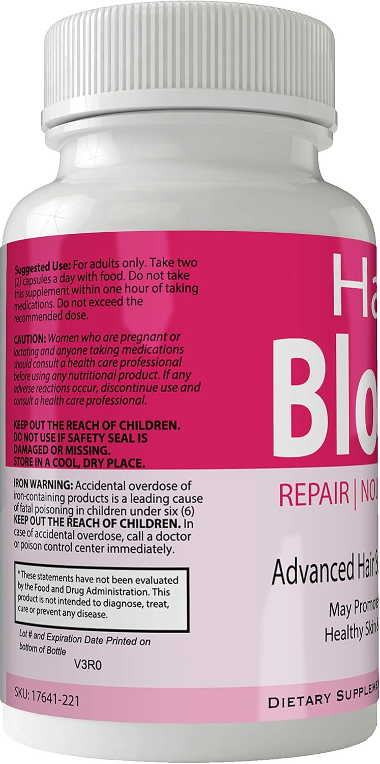 Our Hair Bloom Hair Growth Pills Skin and Nails Supplement Capsules Hair Growth Vitamins including Biotin for hair growth clearer skin and stronger nails. Gluten-Free maxi Mulitvitamin Supplement for woman and men.