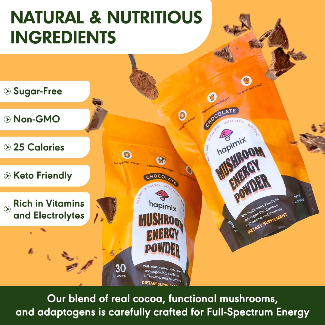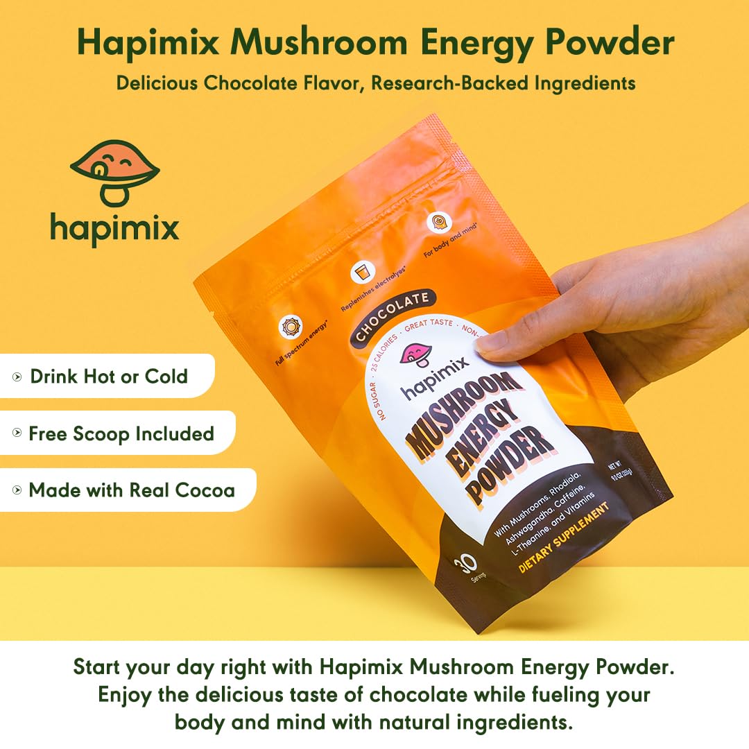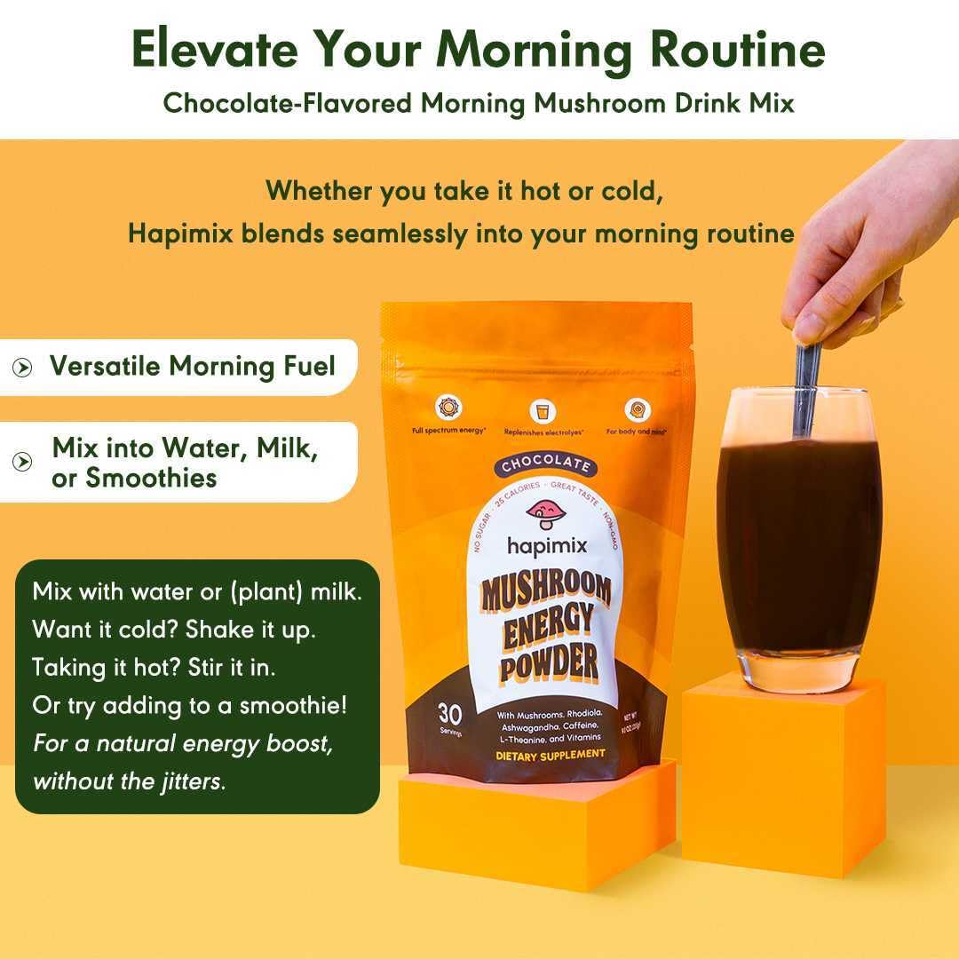For a natural morning boost – Hapimix’s new chocolate energy powder blend with functional mushrooms and adaptogens is a great way to start your morning without the jitters, or crash from coffee. Use the provided scooper to add one scoop of powder to 10-12 ounces of water or your favorite (plant) milk, stir or shake, and enjoy!