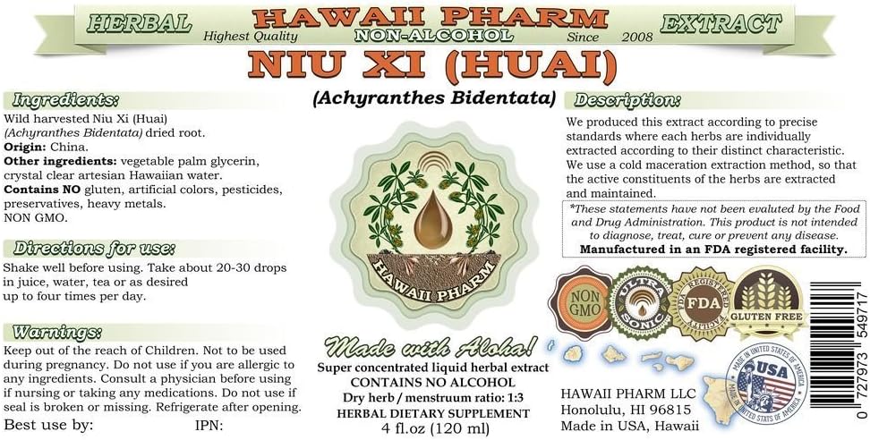Hawaii Pharm Niu Xi (Huai) Alcohol-FREE Liquid Extract, Niu Xi (Huai), Achyranthes (Achyranthes Bidentata) Root Glycerite Natural Herbal Supplement, USA 2 fl.oz