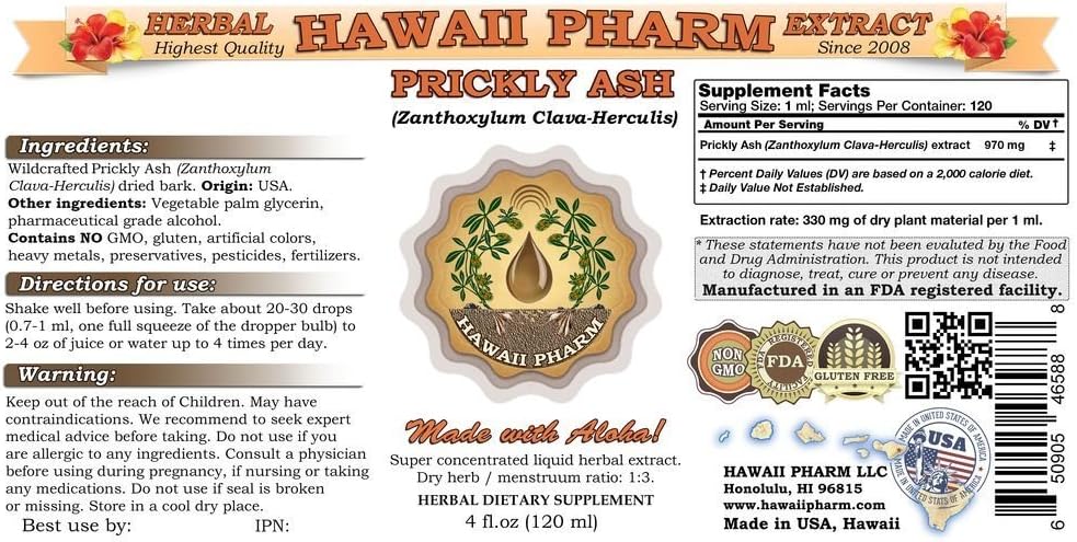 Hawaii Pharm Prickly Ash Liquid Extract, Prickly Ash (Zanthoxylum Clava-herculis) Tincture, Herbal Supplement, Made in USA, 4 fl.oz