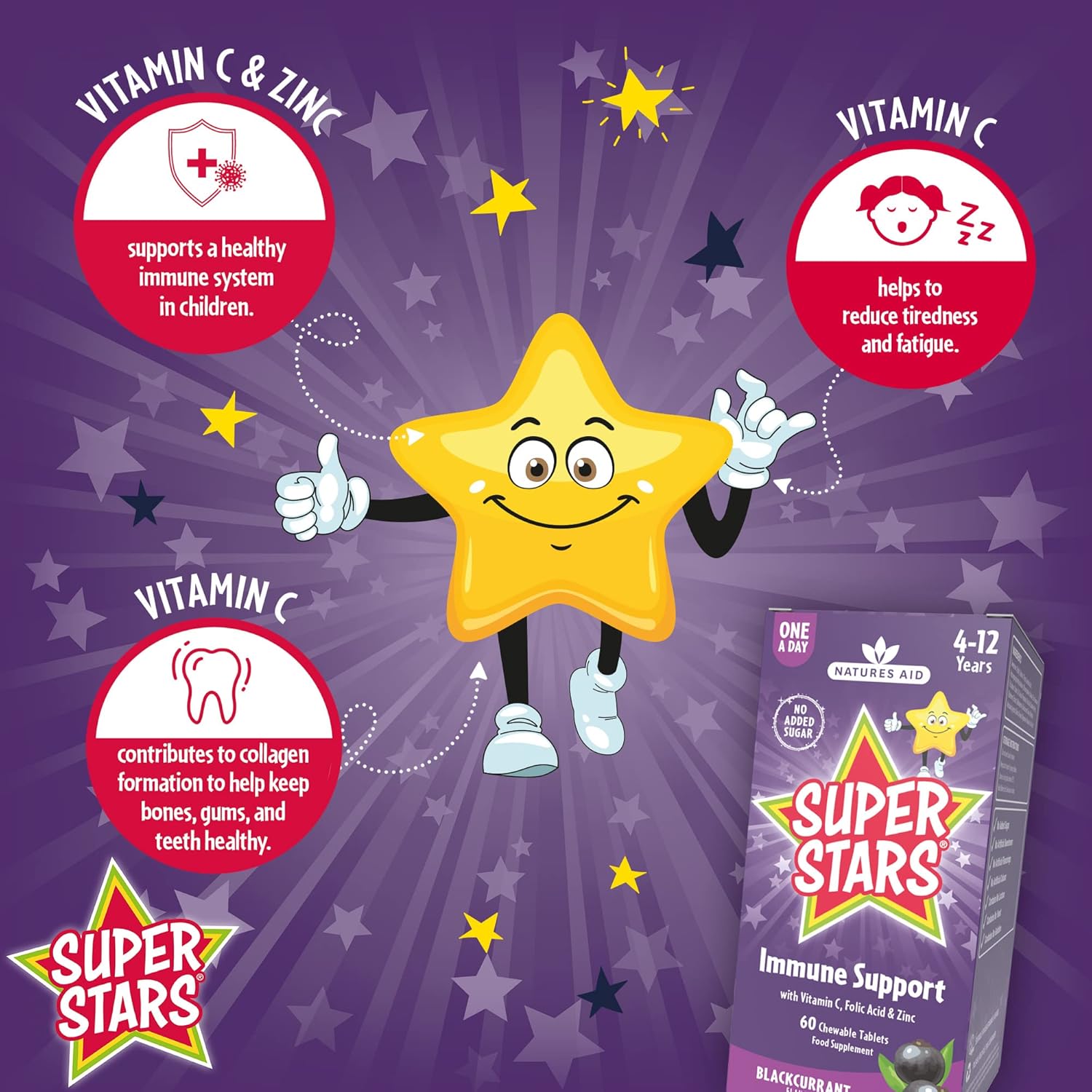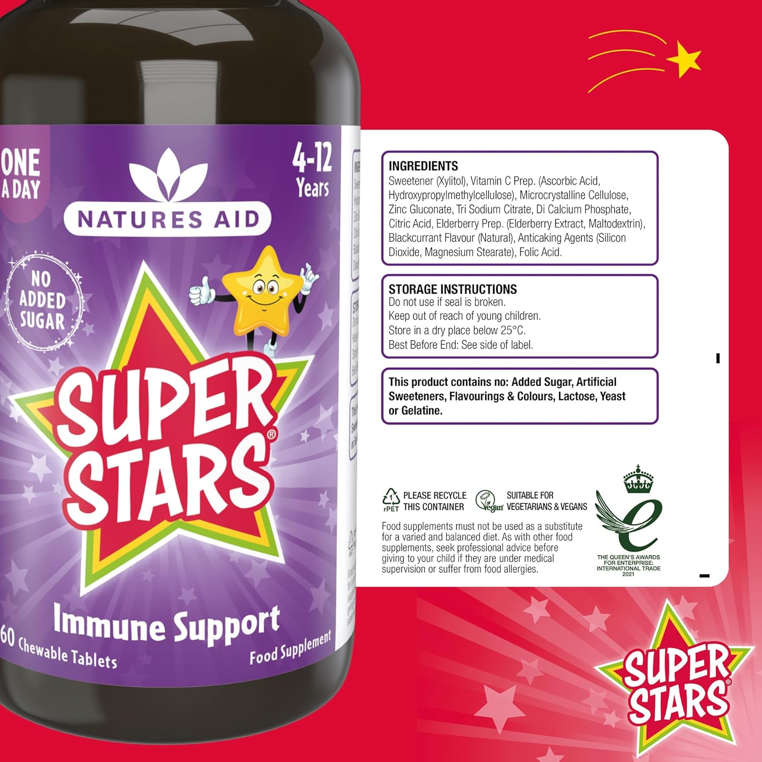 Our Super Stars Immune Support chewable tablets provide an expert blend of Elderberry extract alongside Vitamin C, Folic Acid, and Zinc, which contribute to the normal function of the immune system. Vitamin C is an essential Vitamin that also contributes to a reduction in tiredness and fatigue. Super Stars Immune Support chewable tablets with a natural blackcurrant flavourare easy to take. Contains no added sugar, artificial sweeteners, flavorings, or colours and is lactose, yeast, and gelatine free. Available for children aged 4 to 12 years old. Suitable for vegans and vegetarians. Made in Uk. A child’s development is a crucial time in their lives, with so many changes as they grow, there is also a great nutritional demand, to ensure your child is benefiting from the nutrients they need. Natures Aid children’s supplements are developed with care to deliver fuss-free products that deliver optimal nutritional value and peace of mind for parents. Welcome to Natures Aid, we are a dedicated team of natural health experts committed to offering our customers the very best in natural supplements. Natures Aid is proud to offer a wide selection of products, which contain these nutrients, to help you support the immune system when you feel that it could benefit from a ‘top-up.’ With our determination and innovation, we create our own brand of Vitamins, supplements, and herbal products, which have fast become one of the UK’s favorites.